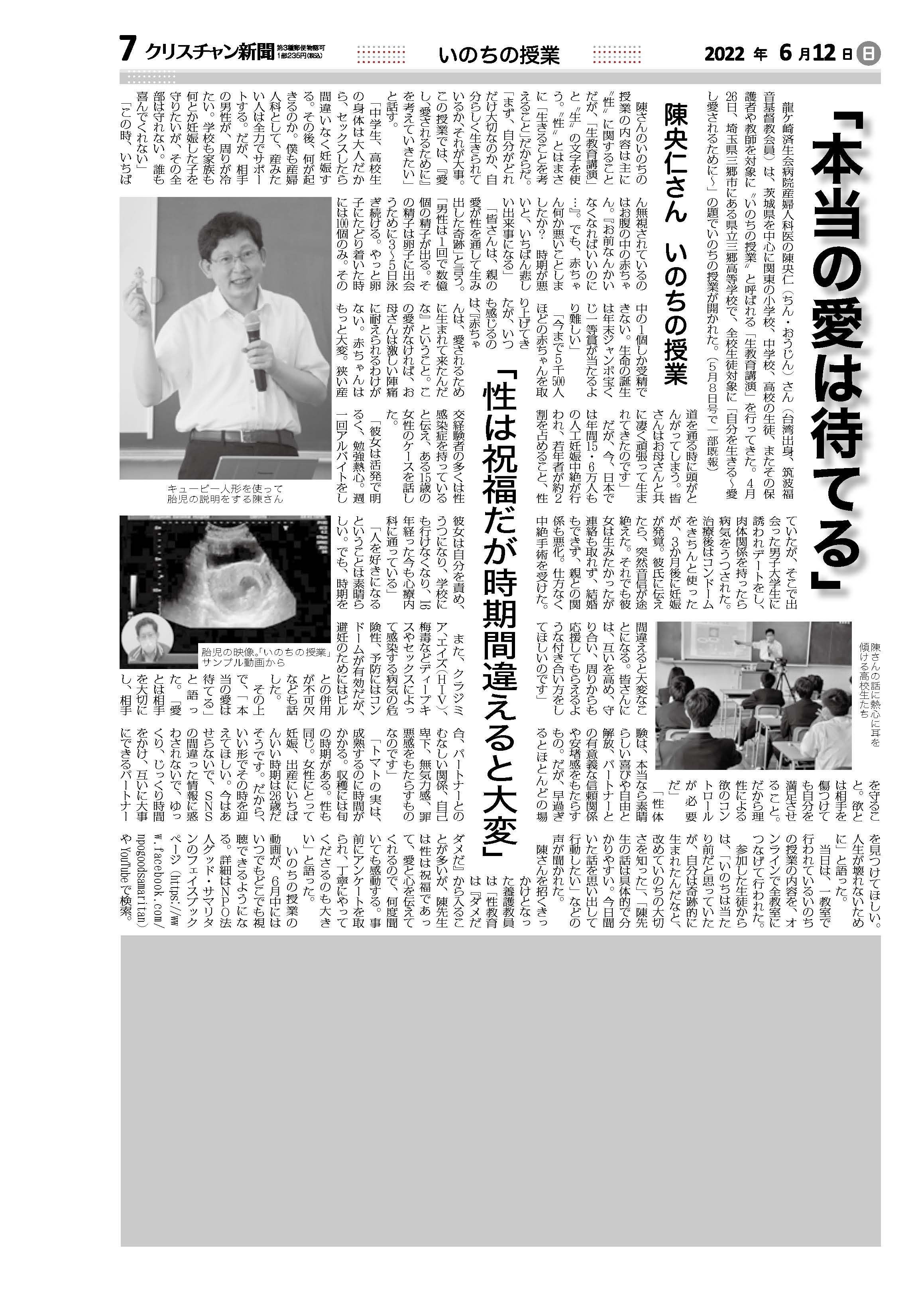 陳央仁医師「いのちの授業」が、クリスチャン新聞福音版 7月号に掲載されました。福音版7月号の試し読み(立ち読み)がこちらから出来ます。https://xn--pckuay0l6a7c1910dfvzb.com/fukuinb/
