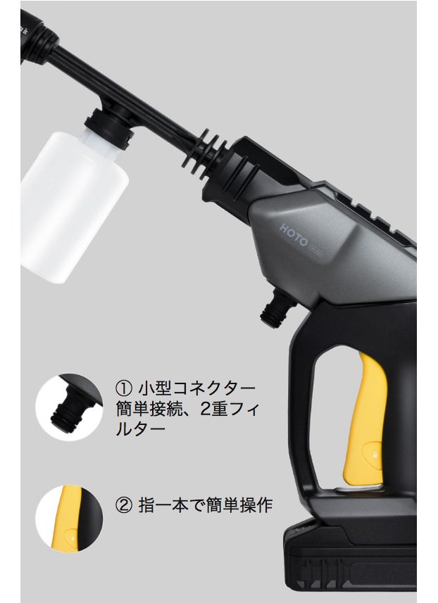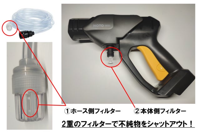 「HOTO HPWM X6」の給水口には2重のフィルターを搭載しており、水に含まれるゴミや砂などの不純物をろ過し、対象を傷つけない仕様になっており、安心して作業できます。