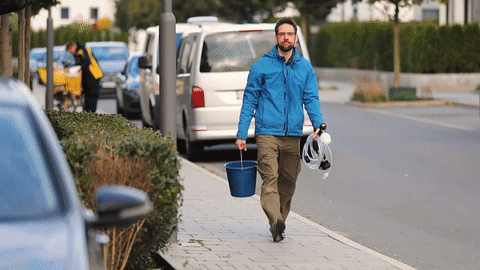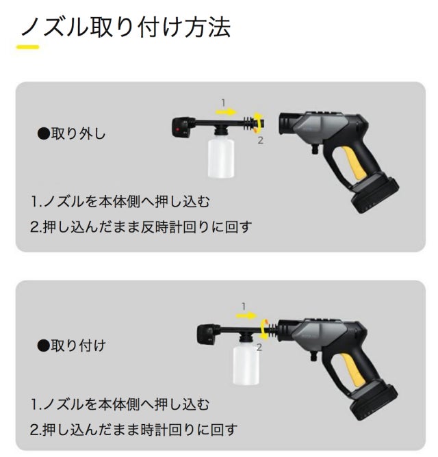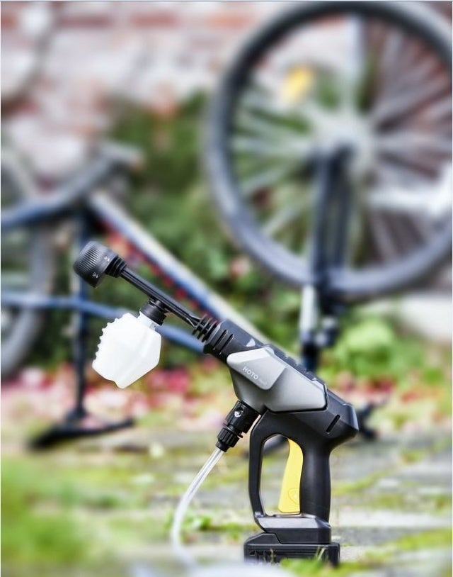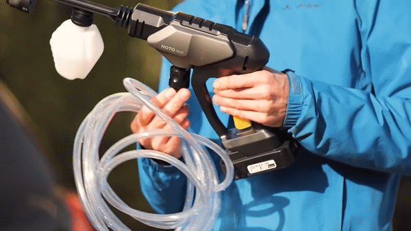 美しいミニマルデザインの本体にノズルとホースと洗剤タンク、バッテリーを取り付け、水の入ったバケツにホースの先端を入れるだけで準備OK!