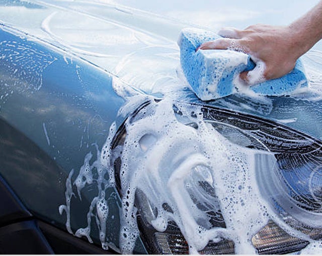 洗剤泡が乾く前に、洗車用のスポンジで擦りましょう。
