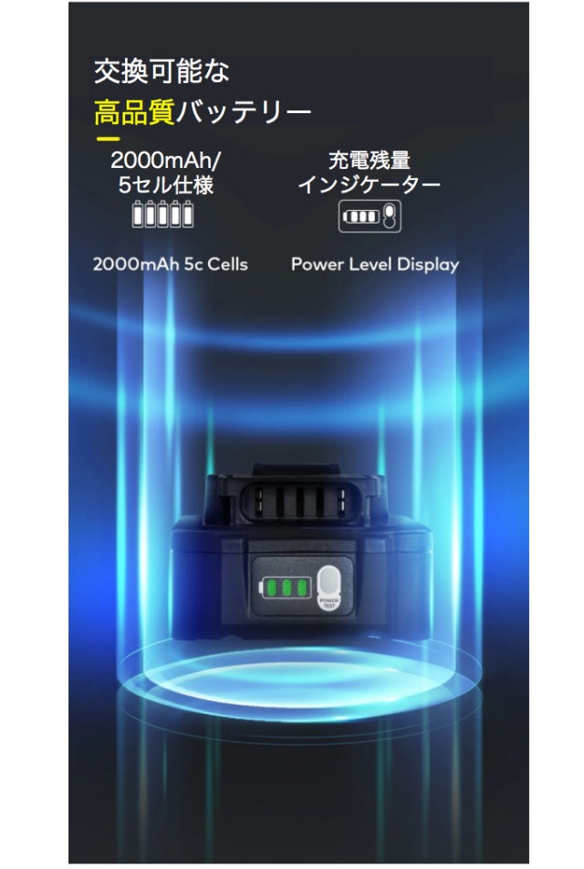 たった1.2kgの小型軽量ボディに、大容量2000mAhバッテリー搭載のコンセント不要タイプのため