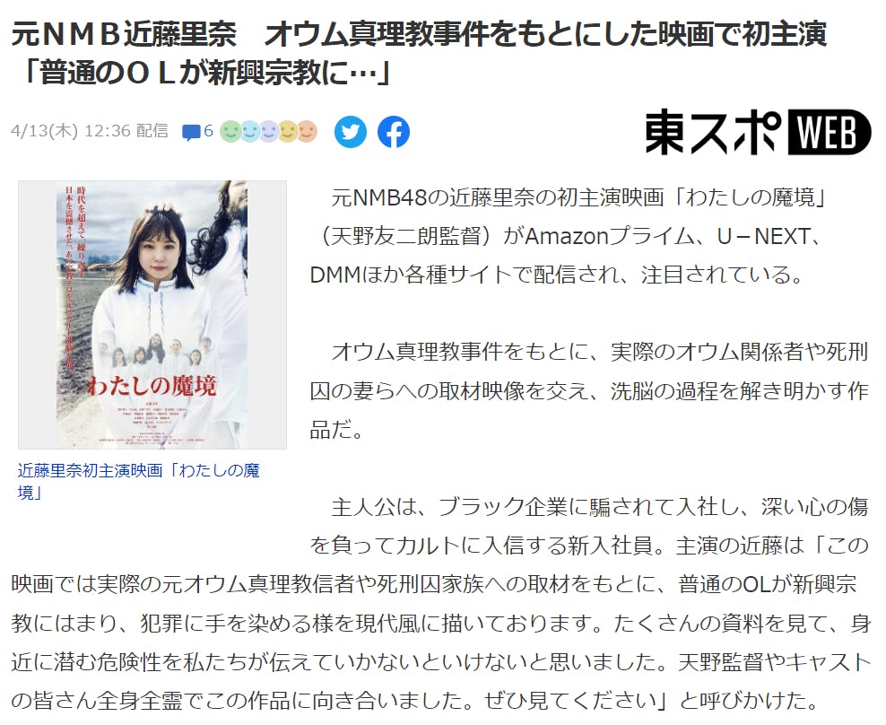 本作に興味を持ったライターさんからのお声がけで、Yahoo!ニュースと東スポに掲載して頂きました。監督のコメントや、主演 近藤里奈さん、出演者 江藤あやさんらのコメントなどが掲載されています。