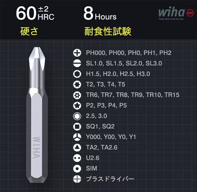 また、ドライバー本体に付属のビットは以下のようになっております。