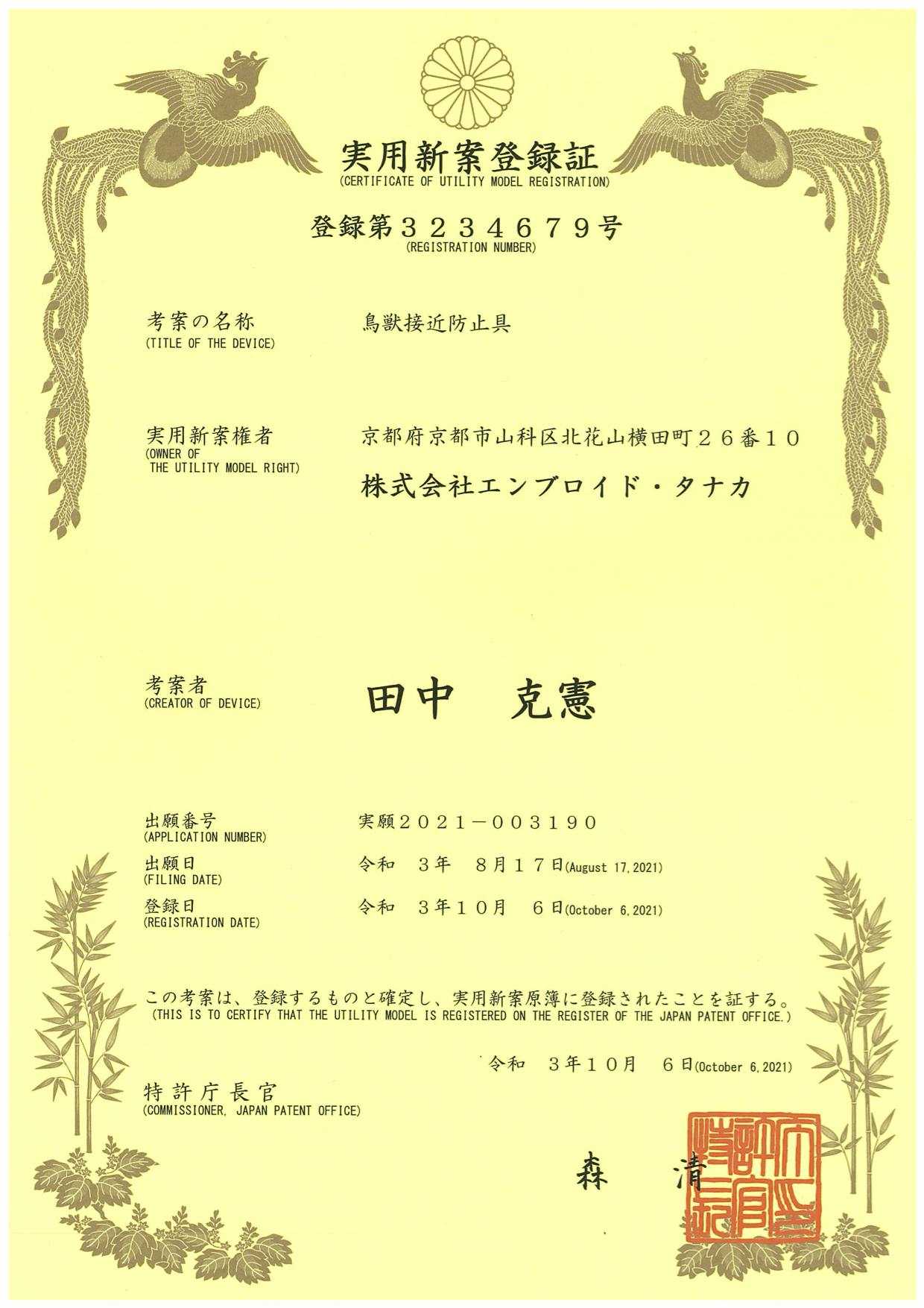 そんな『カラスコナーズ™ 』は、「鳥獣接近防止具」として実用新案登録済みともなっております。