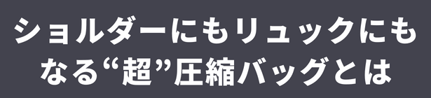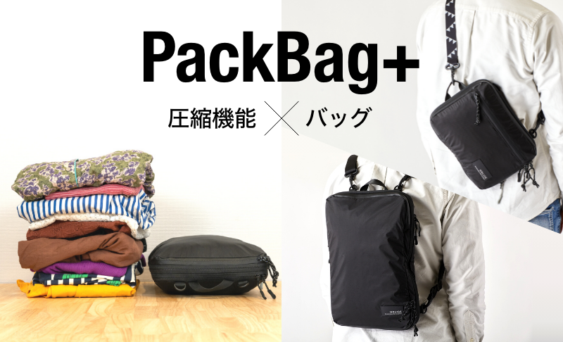 「PackBag+」は、衣類などを簡単かつコンパクトに圧縮し、50%ほどのかさまで荷物を減らすことのできる、”超”圧縮機能と、普段や旅行先で、ショルダーやリュックなど用途や荷物の多さに応じて使い分けられるカバンとしても活用できるという2つの役割を兼ね備えたアイテムです。