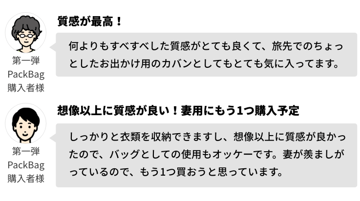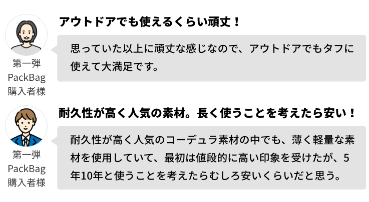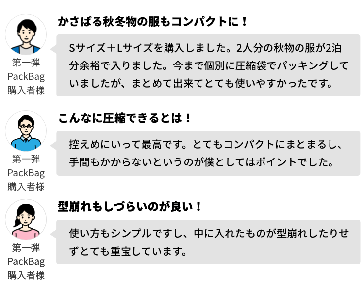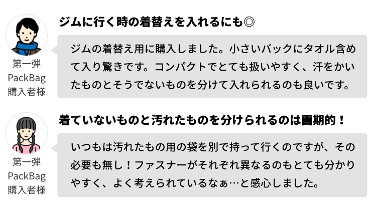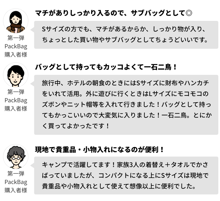 そんなコンセプトで開発し、たくさんの喜びの声をいただいた第一弾のPackBagですが、1200人ものお客様にご購入いただき、使ってみてよかったところ、改善してほしいところなどをアンケートやインタビューなどでお聞きし、たくさんの声が集まりました。