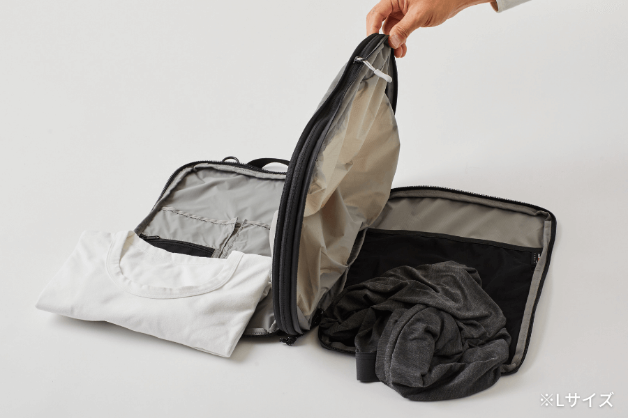 旅の始まりは全て片側にパッキングし、着た後の汚れた服を逆側に入れていくことで、混ざらずに管理できます。片側は止水ファスナーを採用。生地も撥水性があるので、濡れた水着やタオル、汗をかいた服を入れても安心。様々なシーンで活用できます。