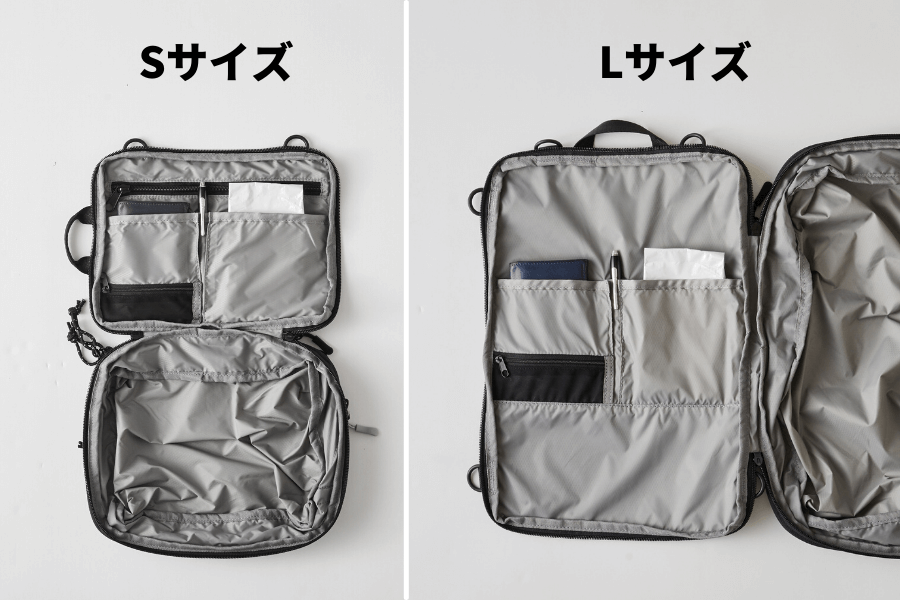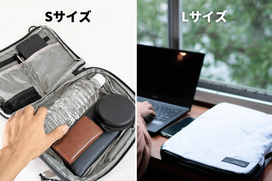 Sサイズは、財布、鍵、本、ペットボトルなどが同時に入り、街歩きにぴったり。Lサイズは、13インチのPCと充電ケーブル、ノート、小物類などの収納が可能。カフェでのリモートワークにも便利です。