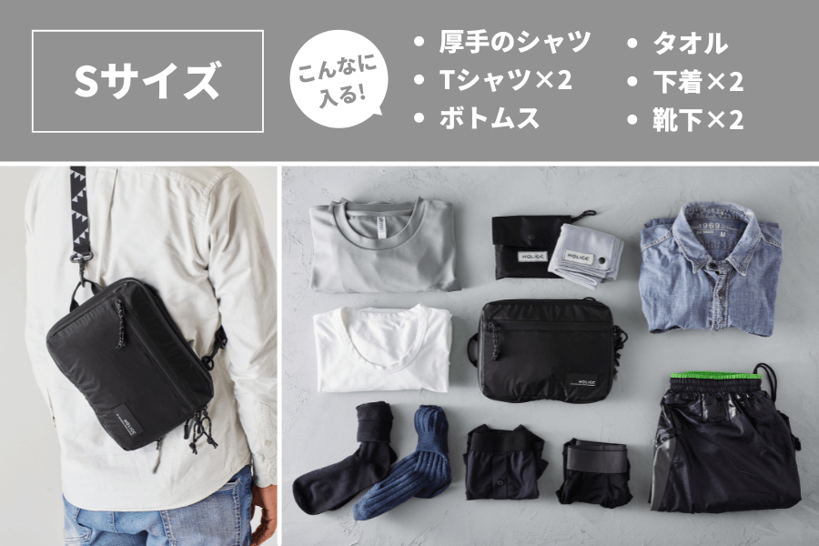 A:それぞれ5ℓと10ℓの容量です。荷物の多さにもよりますが、目安としては、Sサイズは春夏の旅行1泊程度、Lサイズは秋冬の旅行で1泊〜2泊分程度が入ります。