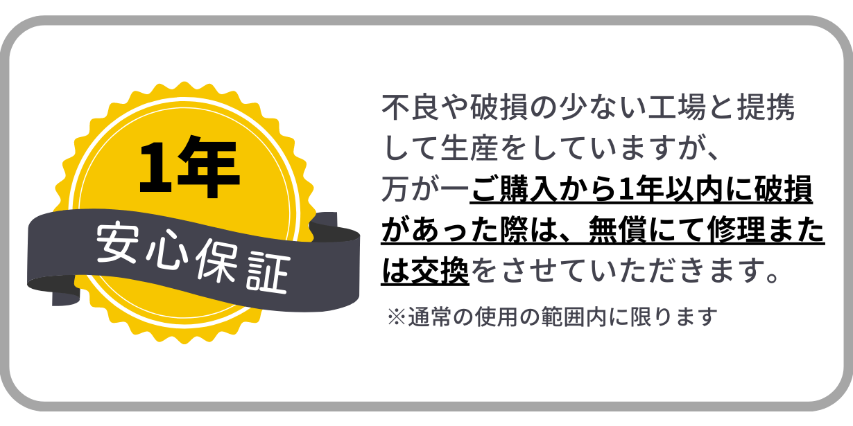 万が一破損してしまった場合でも、無償にて修理または交換の対応を行う1年保証つきですのでご安心ください。(ご購入から1年以内、通常の使用の範囲内での破損に限ります)