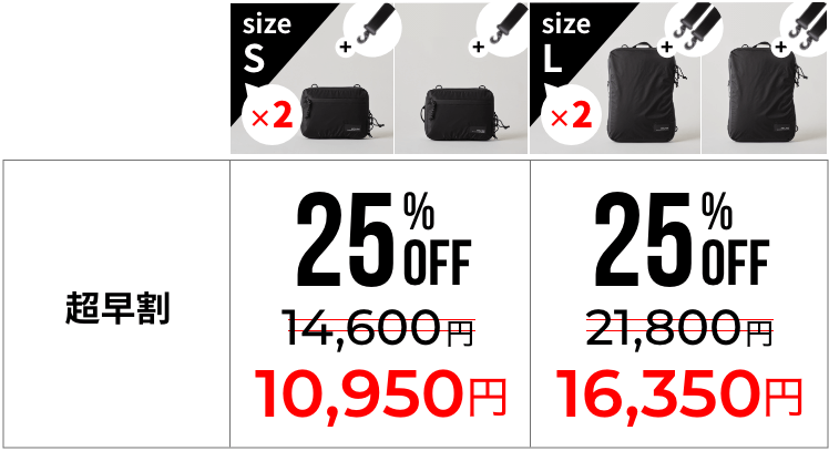 「PackBag+」は、【Sサイズ+ストラップ1本】、【Lサイズ+ストラップ2本】、【Sサイズ+Lサイズ+ストラップ3本】のいずれかの単位にてご購入いただけます。