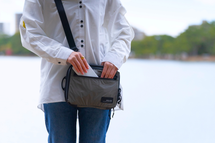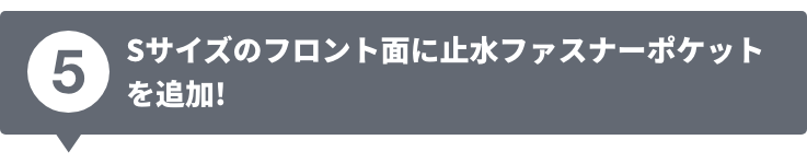 「チケットなどをパッと入れるところが表に欲しい」というご意見をいただき、ショルダーバッグとして使う際に小物などをすぐに取り出せるポケットを、Sサイズのバッグに追加。止水ファスナーのため、雨などで水がかかっても中が濡れません。中に濡れた物をいれて使うのも◎。