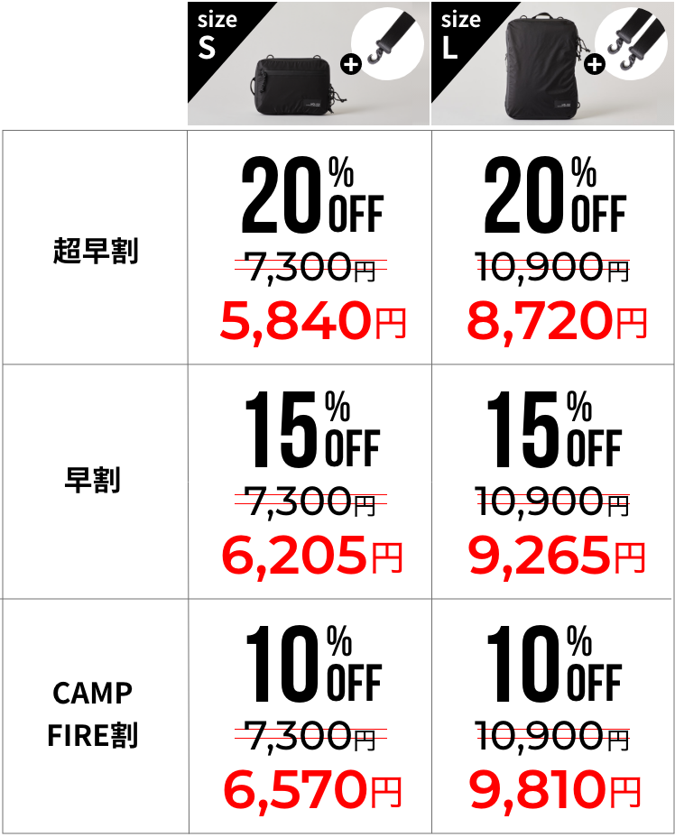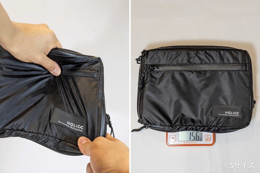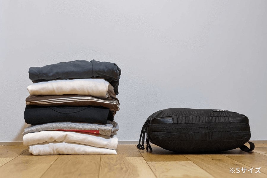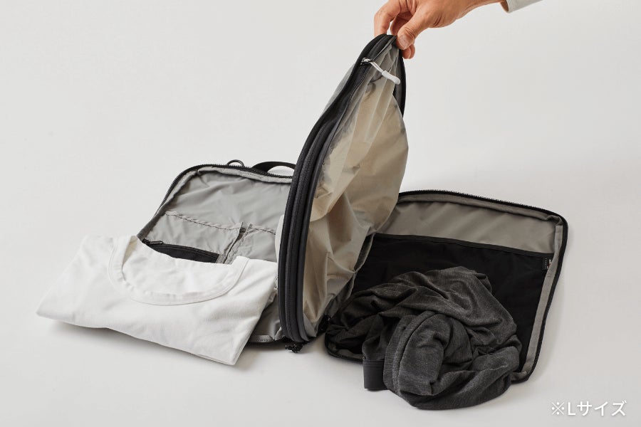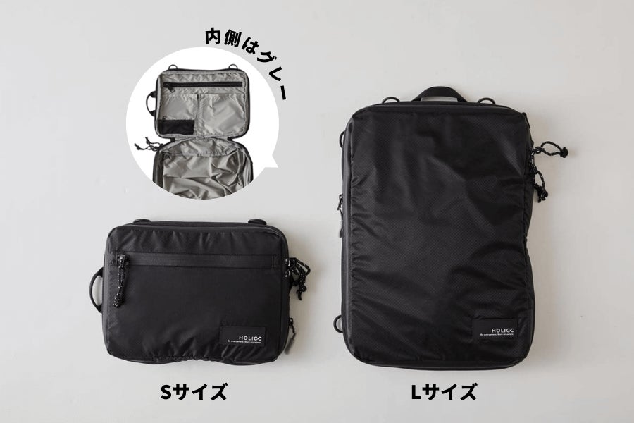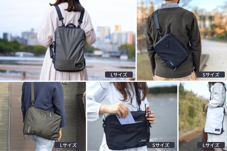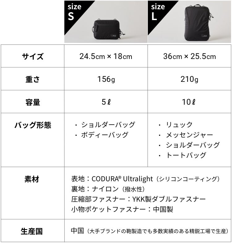 短い旅行や夏の旅行の荷物ならすっぽり入り、ショルダー・ボディーバッグにもなる「Sサイズ」と、パーカーやデニムなどかさばる衣類でもまるっと圧縮できて、トートやメッセンジャーバッグ、更にはリュックにもなる「Lサイズ」を販売いたします。