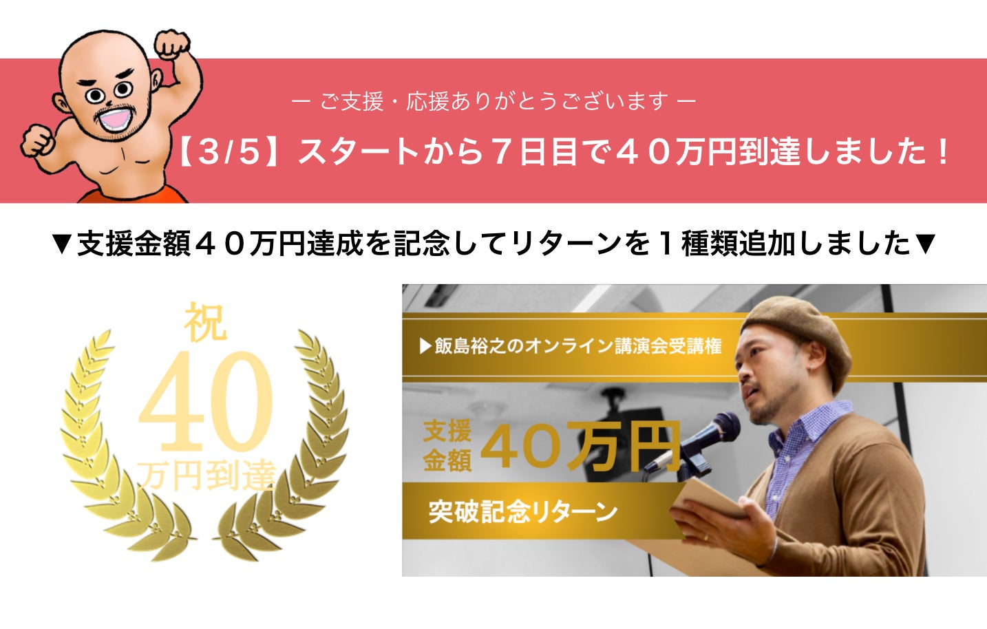 ご支援・応援していただいている皆さま、いつもありがとうございます。飯島裕之です!おかげさまで、クラファンスタートから7日目に支援金額が40万円を。支援者数が50人を超えました。さらなるネクストゴール50万円到達に向けて走り続ける中ではありますが、『トップ画像の新調』『40万円突破記念リターン』をご用意させていただきました。今まで既に1度ご支援してくださった方でも気軽に追加支援を楽しめるようなリターンとなっておりますので、ぜひチェックして下さい!!プロジェクトページへのNEWトップ画・NEWリターン反映は、3月10日昼12:00となります!次のネクストゴール "50万円" に、もし到達することができたら…記念すべきデビュー戦用に『煽りV』を制作し、支援者様全員に動画データでお届けします。(デビュー戦の会場がVTRを流せる施設であればデビュー戦の入場前に煽りVを流します)最終日4/17まで走り続けますので、引き続き応援よろしくお願いいたします!飯島裕之