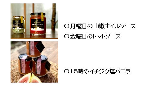 “月曜日の山椒オイルソース”、“金曜日のトマトソース”、“15時のイチジク塩バニラ”など手作りのオリジナルな商品を作っておられます。そして想像を超えたネーミング!