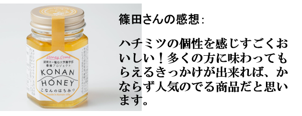 篠田さんは新商品を考えるあたり、KONAN HONEYが本当においしいハチミツなのでKONAN HONEYを知ってもらえるきっかけになる商品を作りたいと思われました。