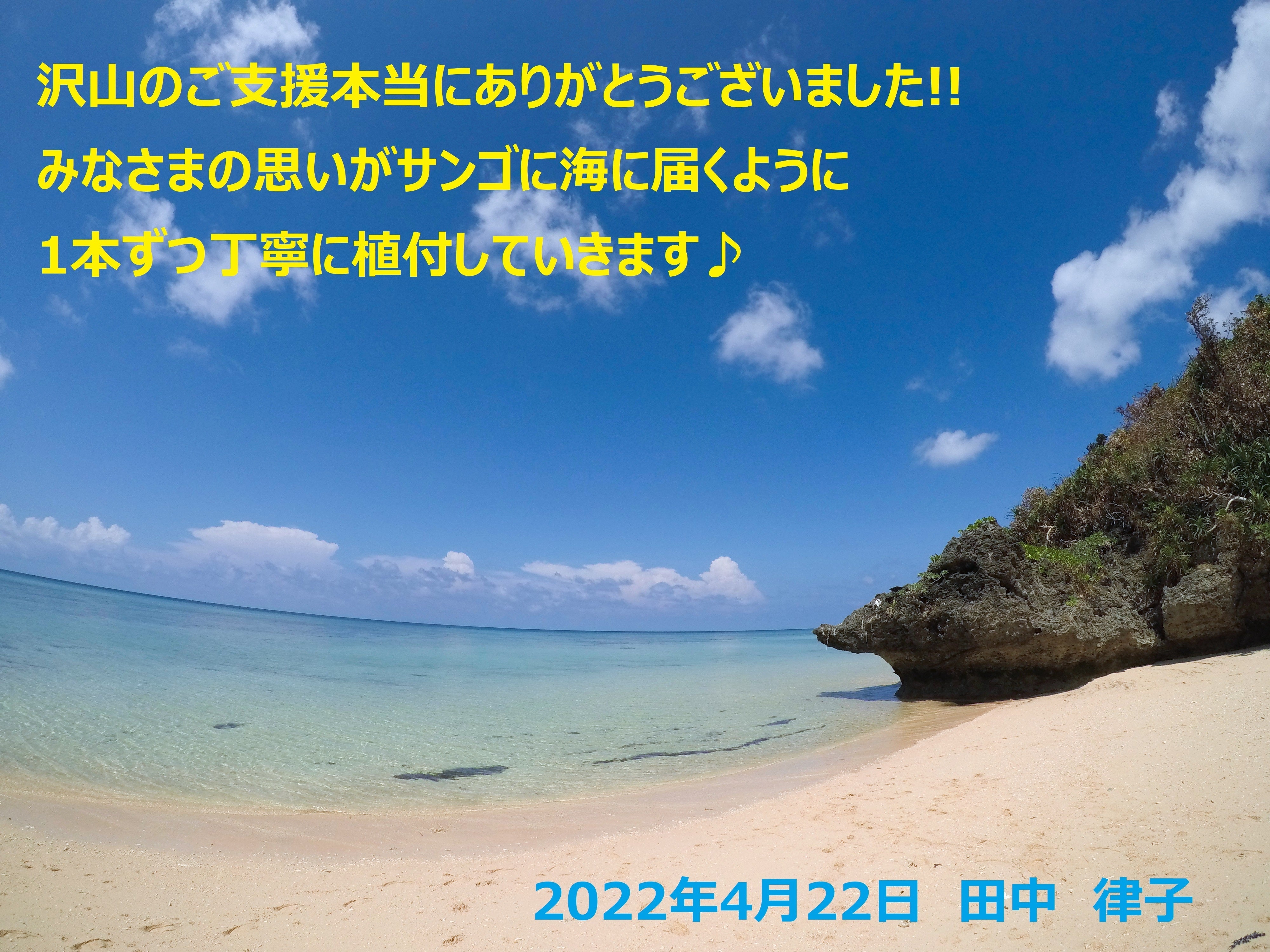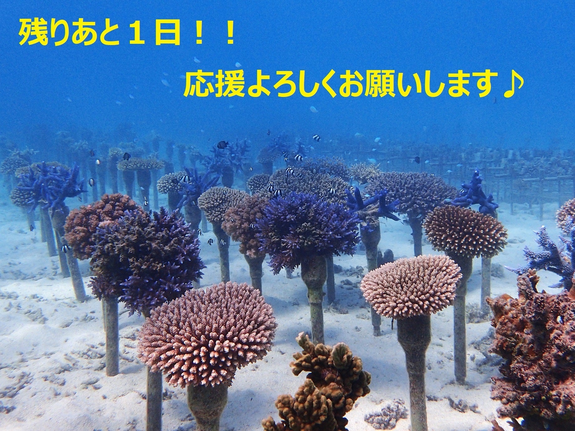 サンゴの日に始まったクラウドファンディング。いよいよ終了しました。みなさまのたくさんの応援、ご支援、本当にありがとうございました!!これから、みなさまの思いをのせて、1本ずつ丁寧にサンゴの植付を行っていきます。また活動の報告など、引き続き報告させて頂きま~す。本当に本当にありがとうございました!!!