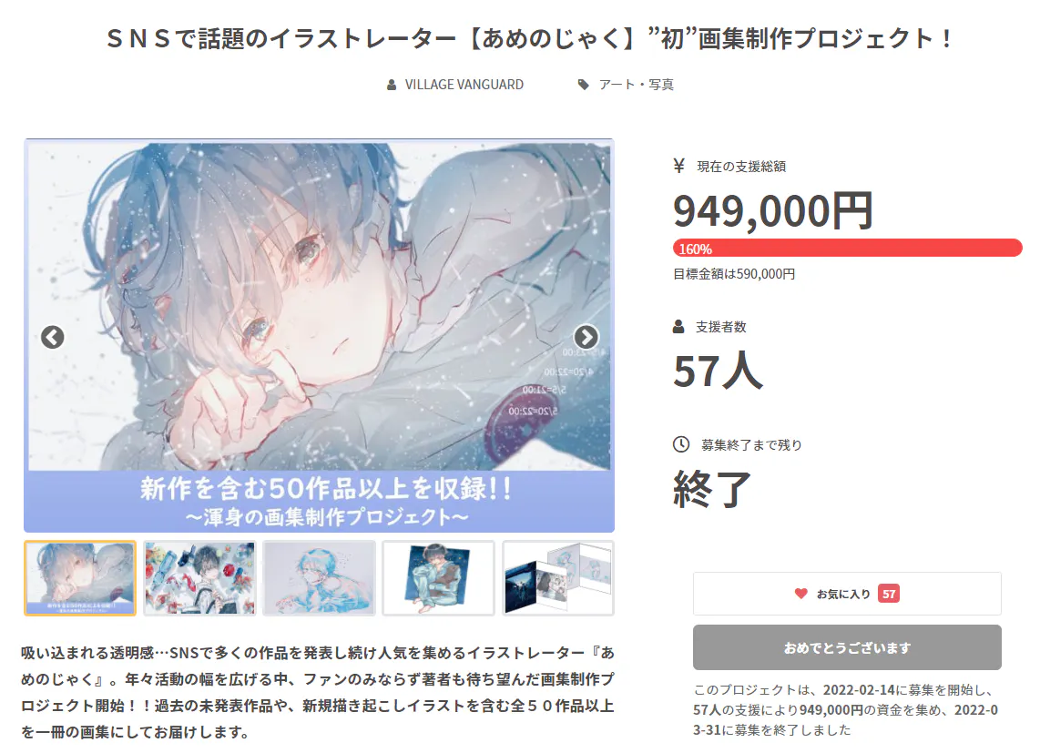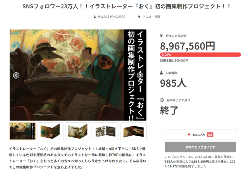 ヴィレヴァンクリエイター応援プロジェクトを立ち上げ、第1弾イラストレーター『おく』・第2弾イラストレーター『あめのじゃく』を応援させていただきました。皆様の応援のおかげで目標金額を達成し、All or Nothing 型を採用 したプロジェクトを実現できております。
