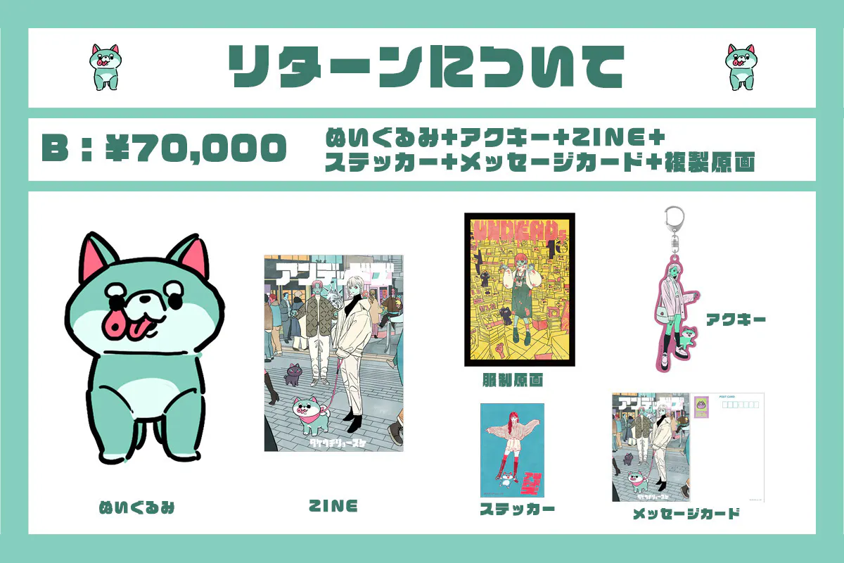 ぬいぐるみに加えて今回のプロジェクトでしか手に入らない、描き下ろしのアクリルキーホルダー・ステッカー・ZINE(過去コラボ企画・書き下ろし含む内容になります)付きのセットです。