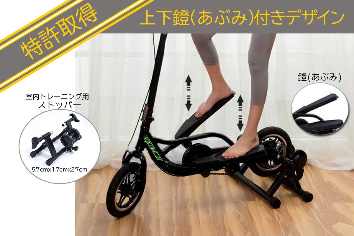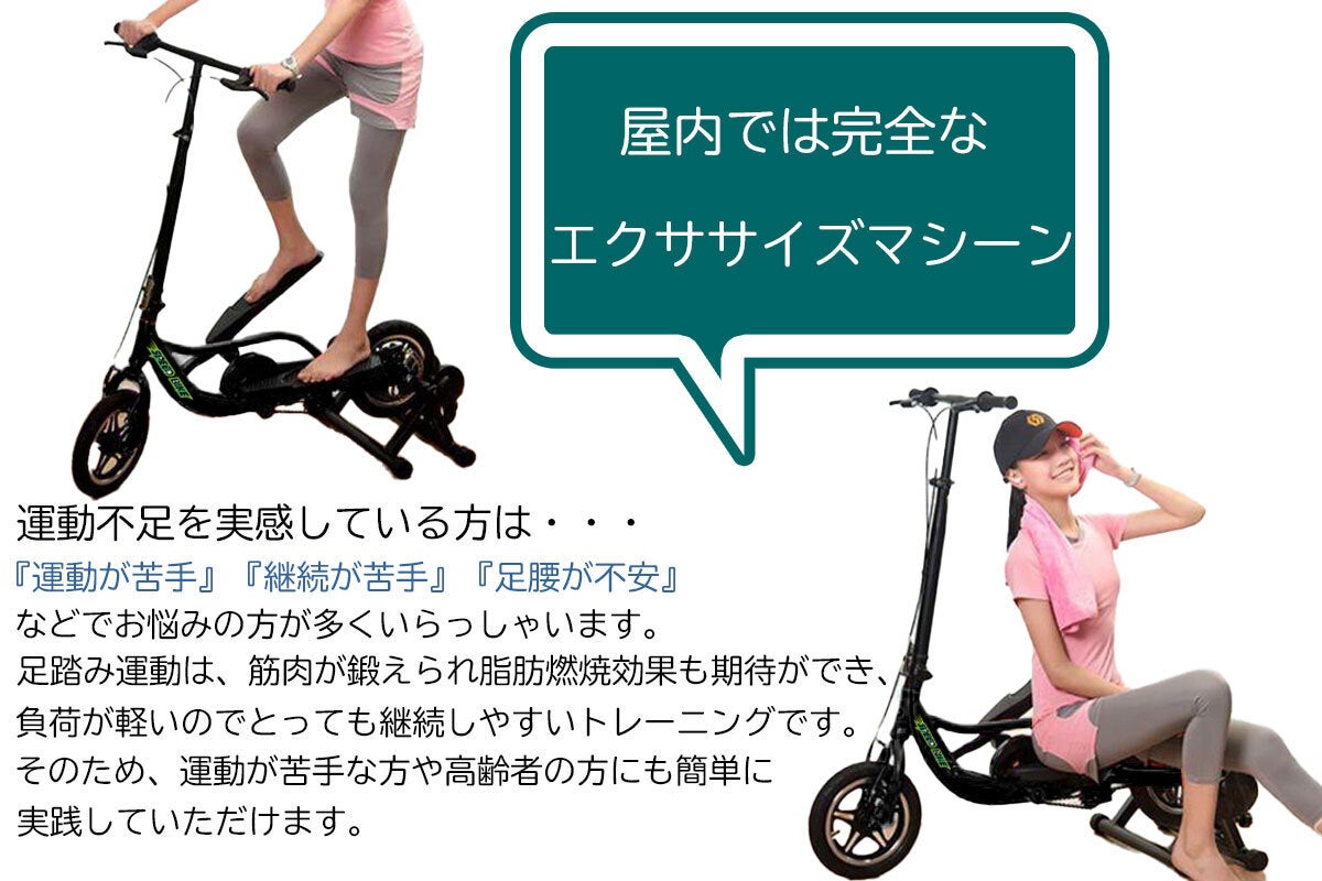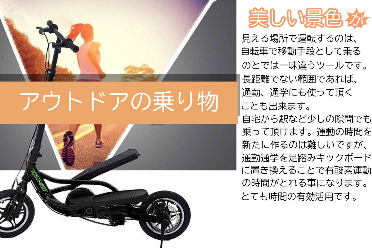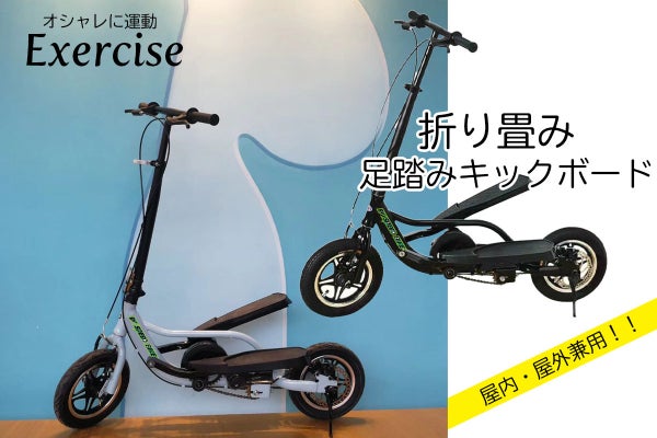 コロナ禍と言うだけでなく季節的にも、外出が有痛に感じる昨今です。そんな毎日を吹き飛ばしてくれるような、商品です。見た目からも、身体を動かしたくなるようなデザインです。こちらの『足踏みキックボード』には大きな3つの特徴があります。