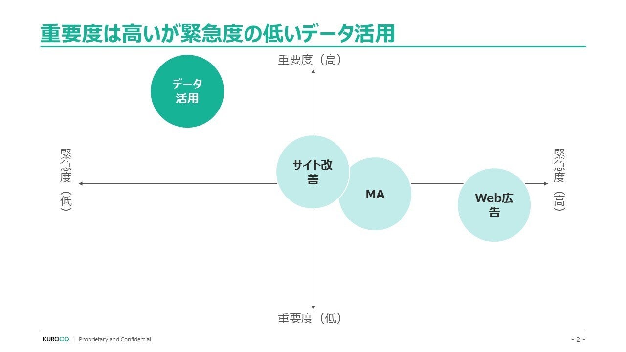 しかし、下記の2つの図のように、企業の目的である「業績アップ」から「データ活用」は距離が遠く、結果、特に日本のおいては「重要度」は高いが「緊急度」は低く、分かりやすい広告やMAなど、目の前の売上を上げられそうな施策にコストをかけてしまいます。
