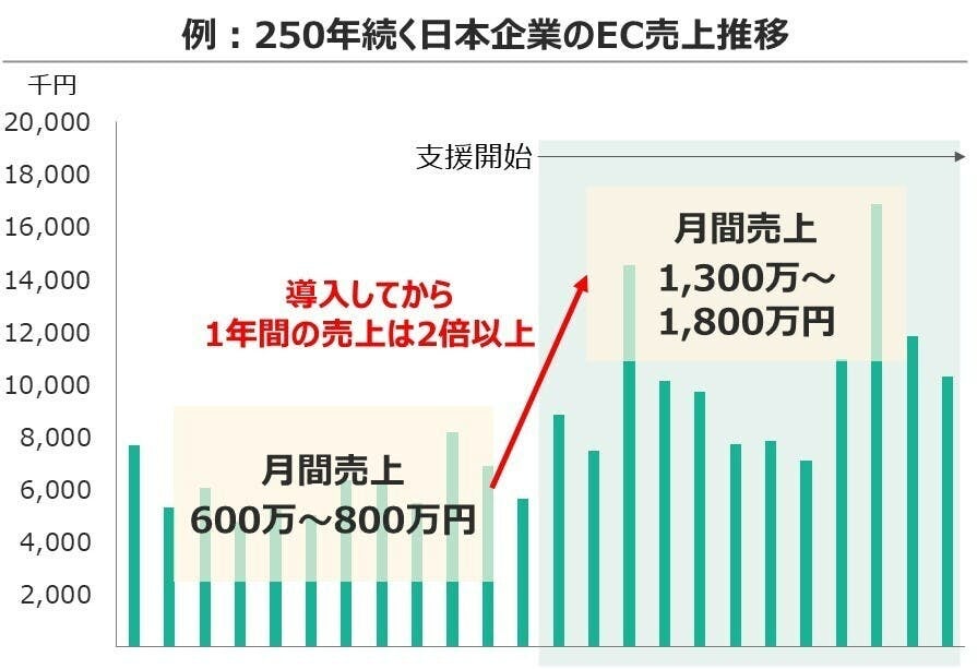ある250年以上続く企業のECサイトにおいては、EC-DashBoardを使った支援を開始して1年間で売上2倍以上を達成しました!