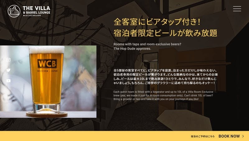 公式サイト『The Villa & Barrel Lounge』では、ホテルの魅力を存分にお伝えしております。ホテルは、全客室にビアタップ付き!宿泊者された方しか飲めない限定ビールが飲み放題です!その他にもたくさんの魅力を紹介しています!ぜひご覧ください。