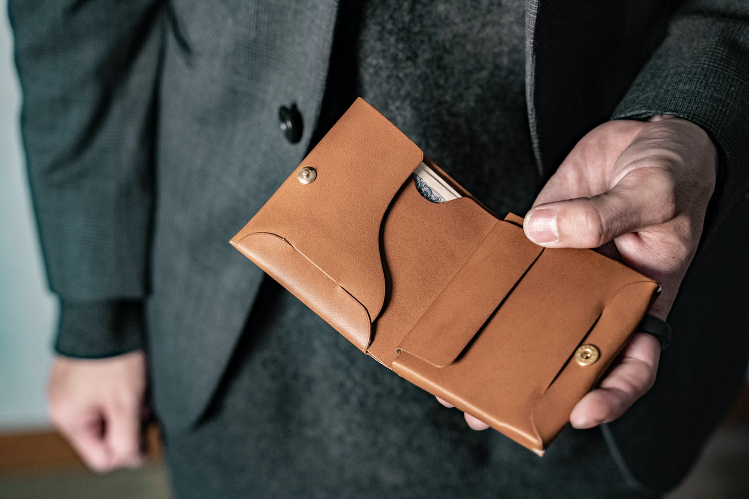 しっかりとお札が隠れた状態で15枚まで収納できる、収納力抜群なお札入れ。お札を取り出しやすいように切り欠けも用意しています。