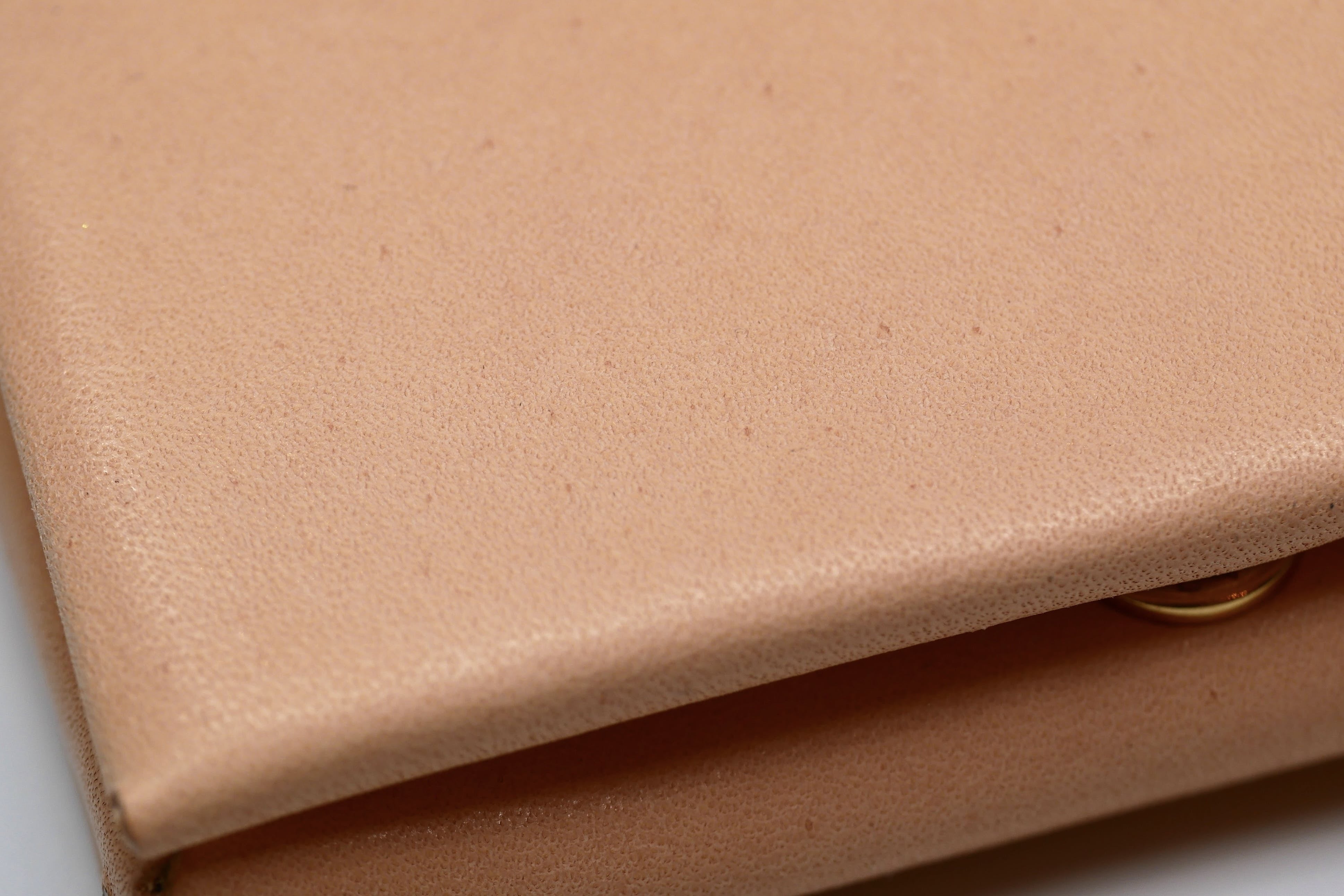 硬く、マットな風合いの革ですが、表層のキメが細かく、経年した後はまるで別の種類の革かのようにツヤ感が出てきます。控えめなオイル感にも関わらず裏面のキメが細かいところからも繊維の密度の高さがわかります。