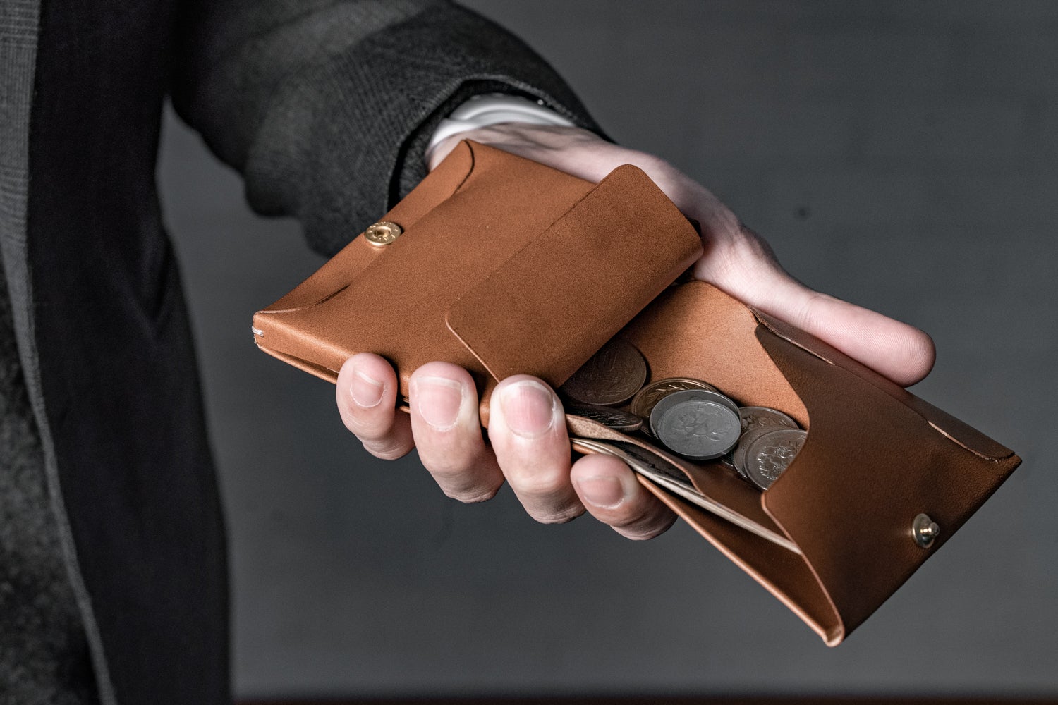 革が馴染むまでは、しっかりと両サイドを潰して「Uの字」型に形をくぼませてから小銭を滑らせてください。