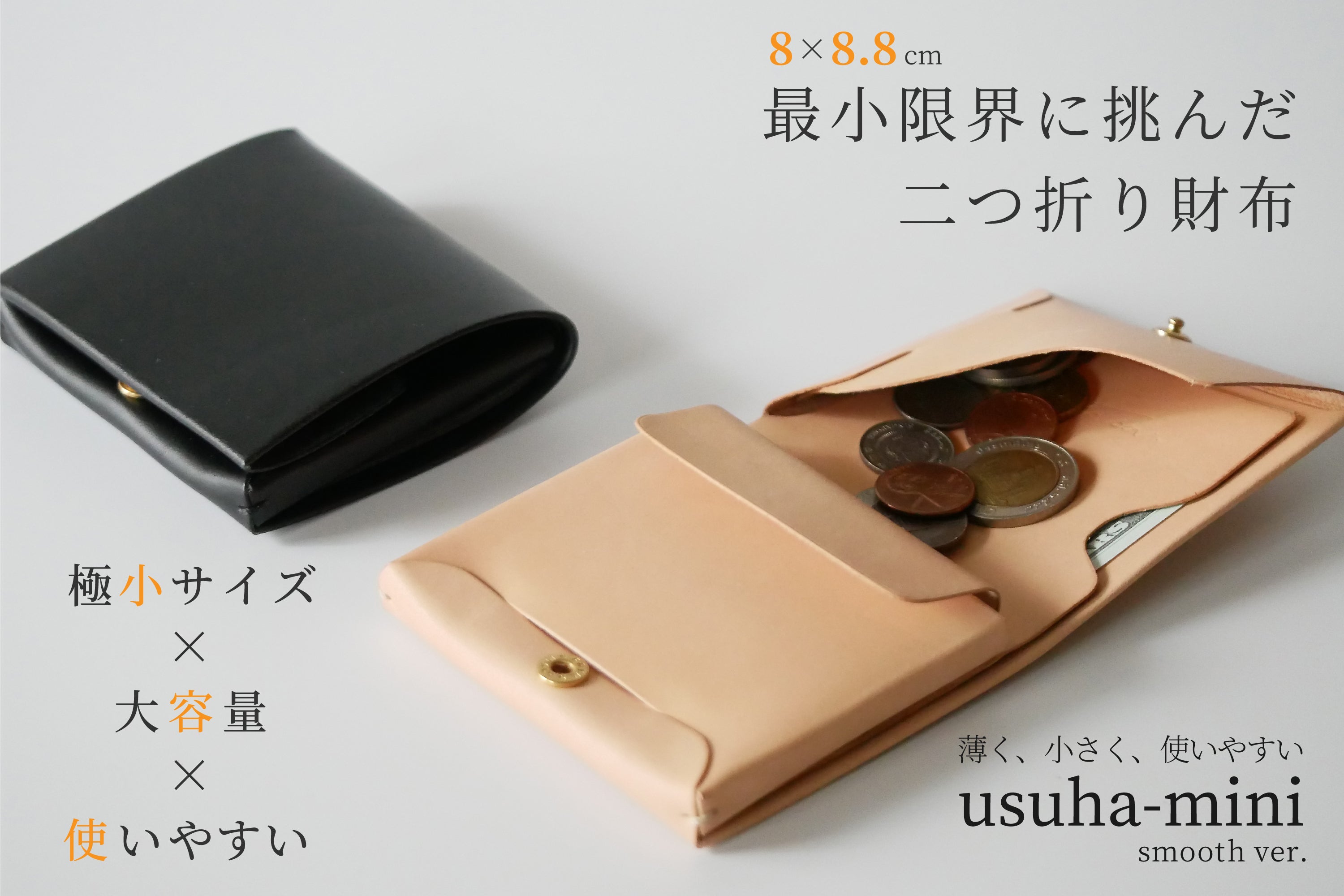 usuha-mini(ウスハミニ)は、二つ折り財布の限界最小サイズに挑みつつも、独自構造で大容量大開口を実現したまったく新しい構造のミニ財布です。