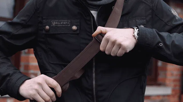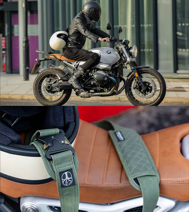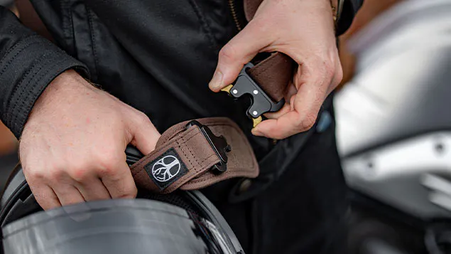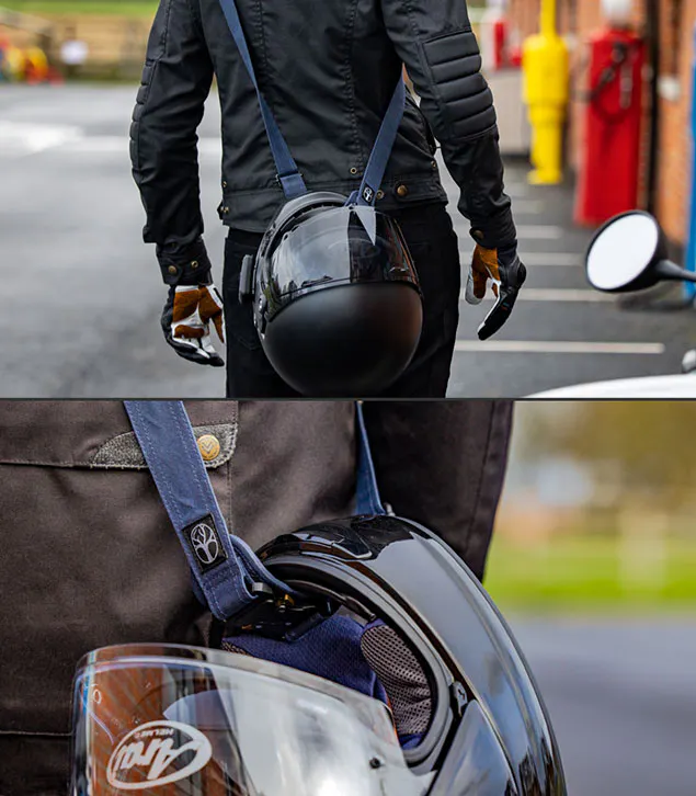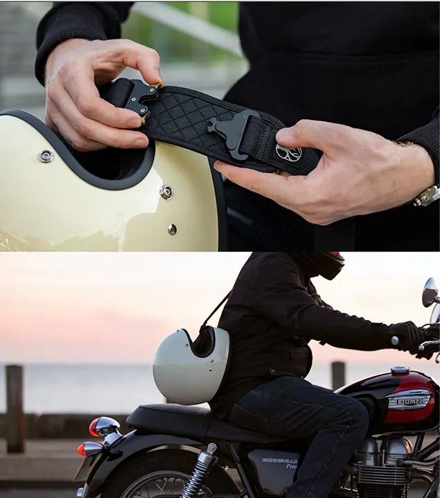 SLINGは、イギリスで産まれたライダーのための『簡単装着できる、持ち運び用のバイク用ヘルメットストラップ』です。