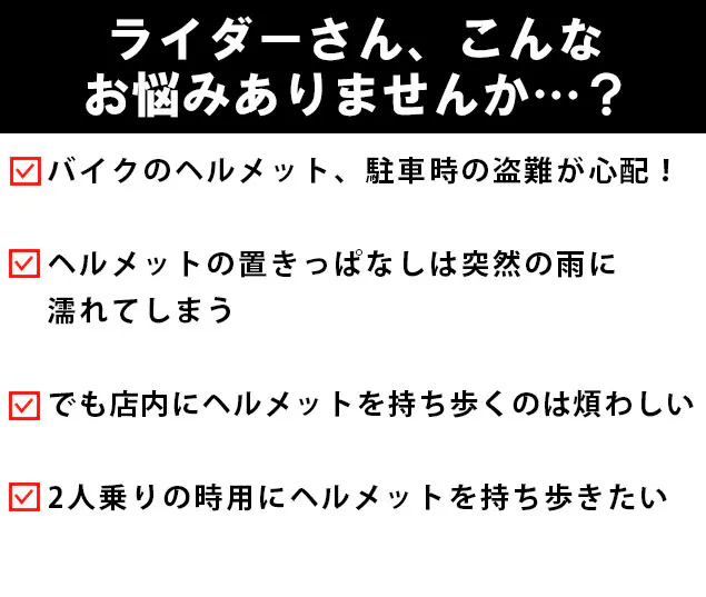 バイクの腰かけ部分に入れたり、本体にロックするのは、盗難が心配…かと言って