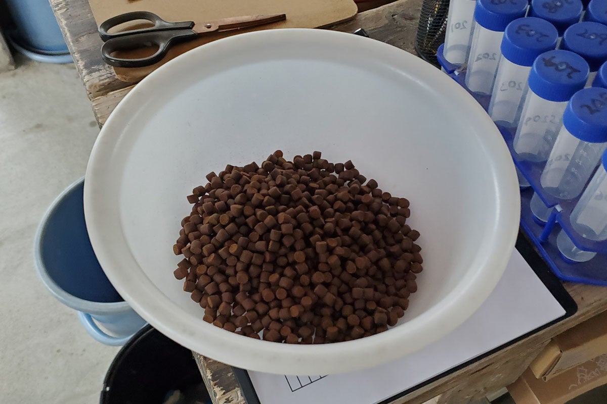 チョウザメのエサ。チョウザメは口がお腹側にあるので、水に沈むエサが使われます。