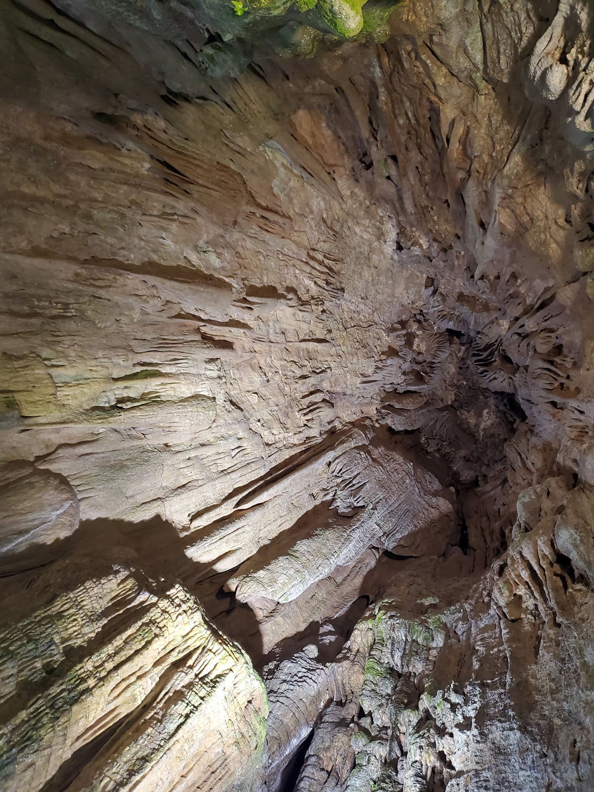 鍾乳洞を流れる地下水はヒタヒタとしたたり落ちながら石灰岩の成分が溶かし込み、成分が再び固まることで天井から垂れ下がるつらら石やタケノコのように伸びる石筍が形作られます。やがてつらら石と石筍がくっついて石柱になります。