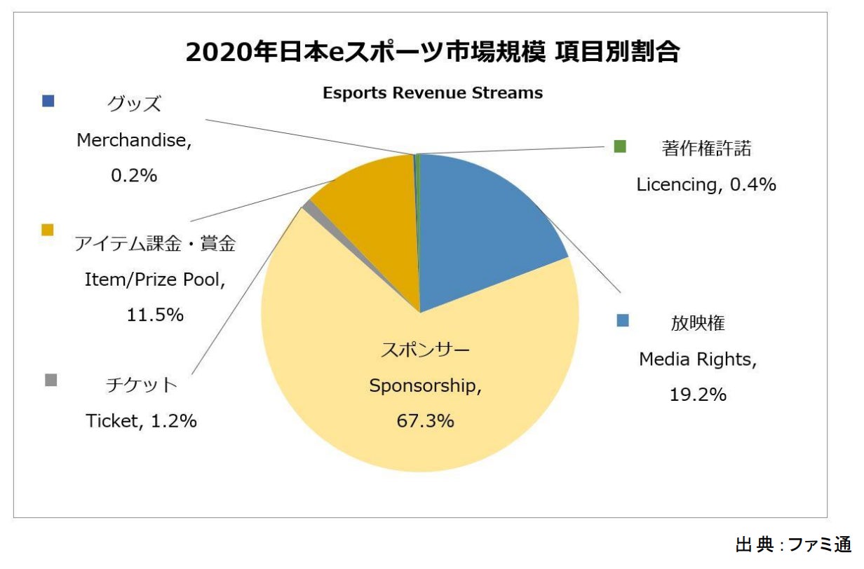 また、2020年における日本 e-sports 市場では約7割をスポンサーが占めており e-sports 市場の発展にはスポンサーが関係してると考えられます。その為、今後もいろいろな企業が e-sports 市場に参入すると予測されます。