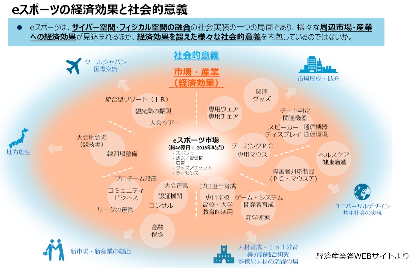 また、e-sports 市場の経済効果としては「市場形成」「ユニバーサルデザイン」「人材育成」「新市場・新産業の創出」「地方創生」「国際交流」などがあげられます。特に近年では地方での e-sports を活用した地方創生が多くなっています。