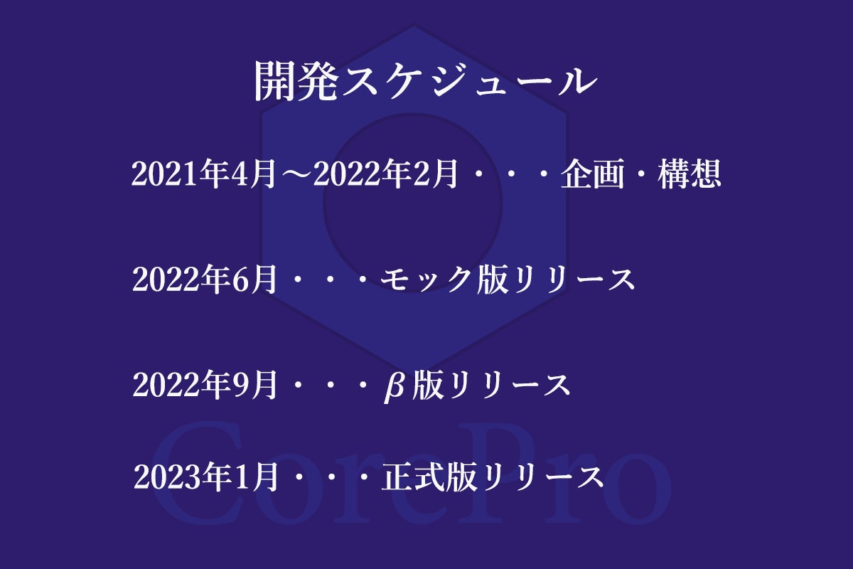 モック版では、CorePro の UI 確認が行える予定です。この段階でユーザからフィードバックをもらい、足りない機能がないかなど確認を行います。