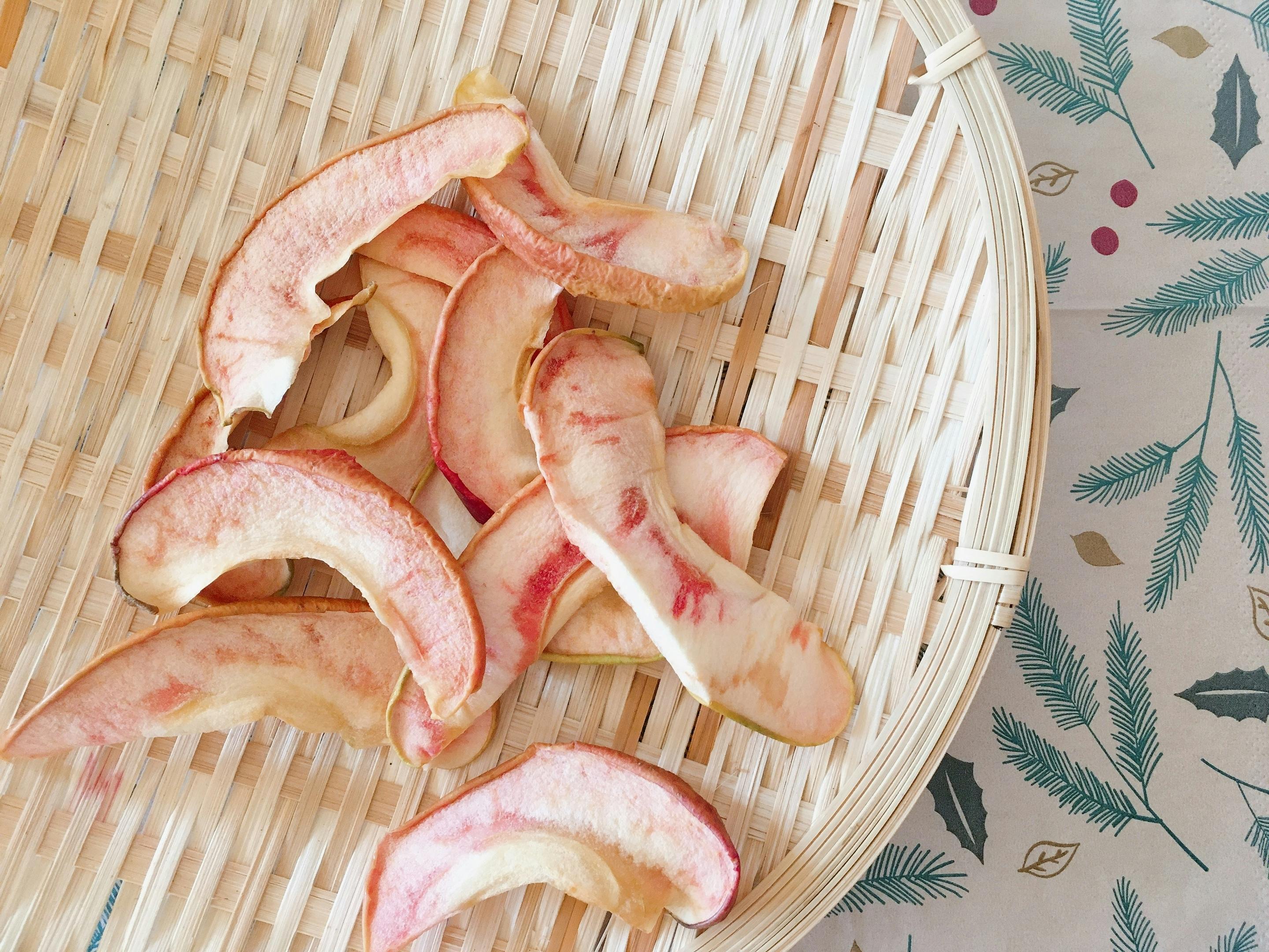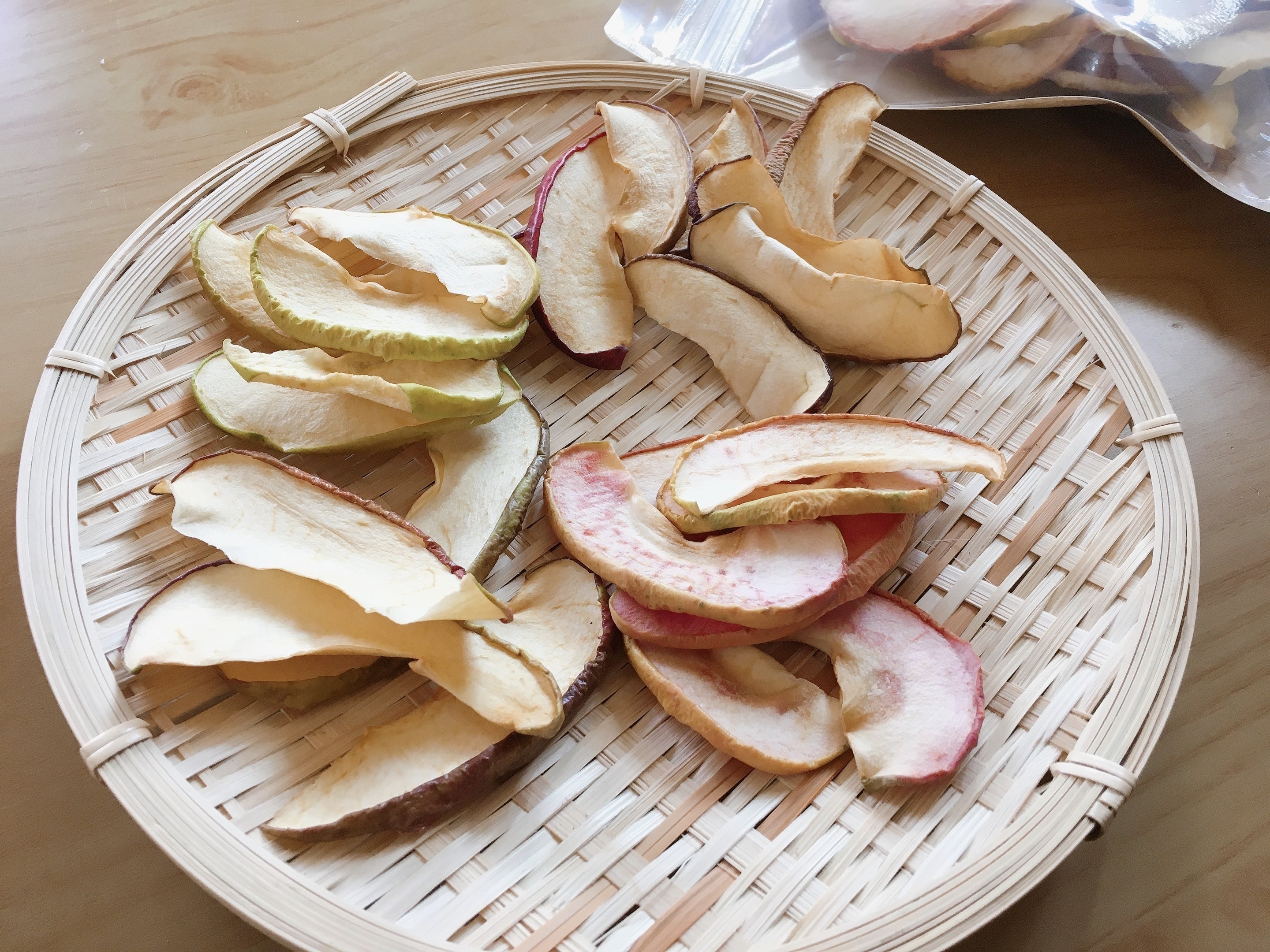 手作業で作るりんごチップスは収穫してから完熟になるまでスノーバルで寝かせてからドライフルーツにしています。りんごの甘さがギュッとつまり、蜜もたっぷりのドライりんごです。