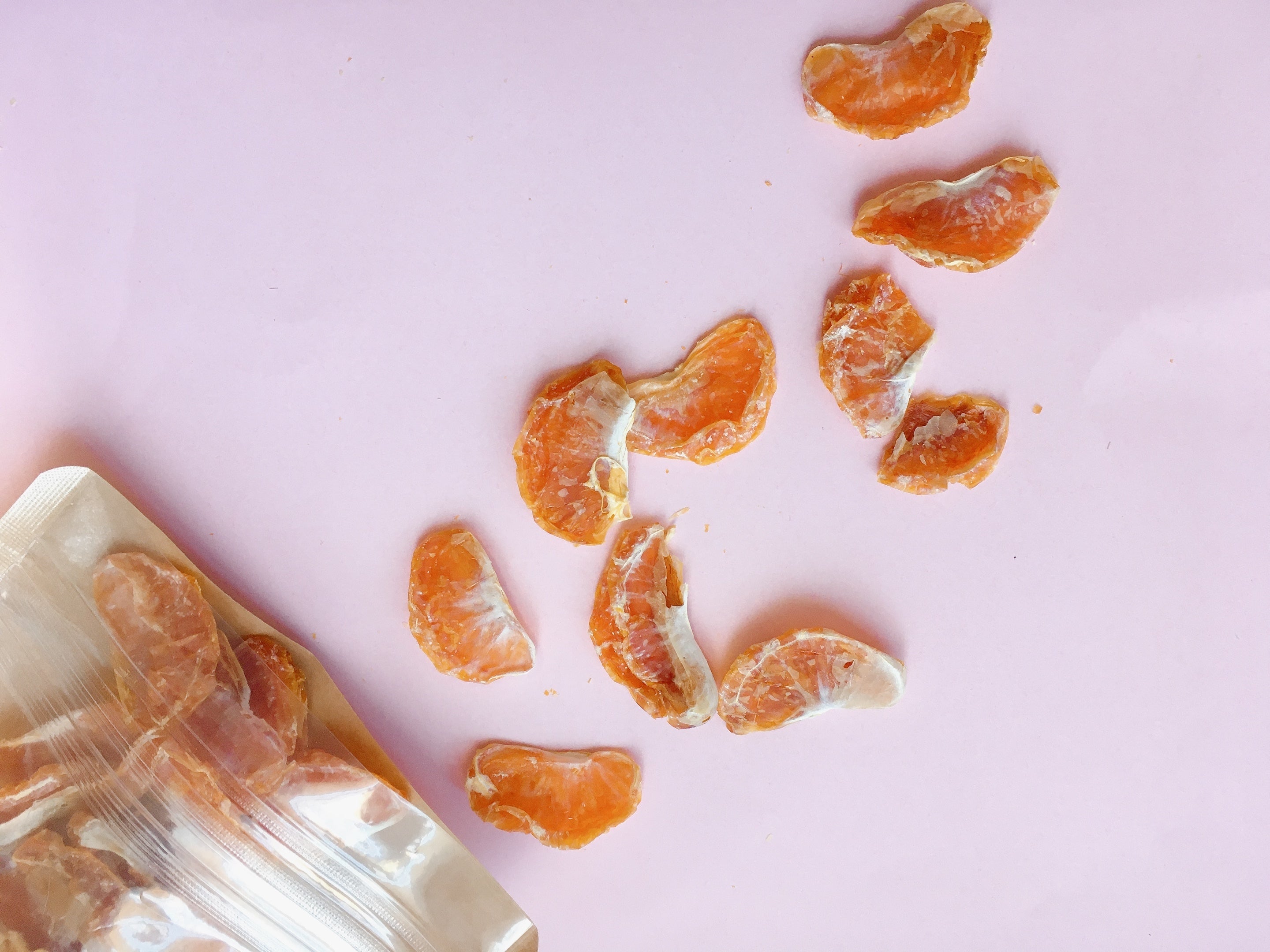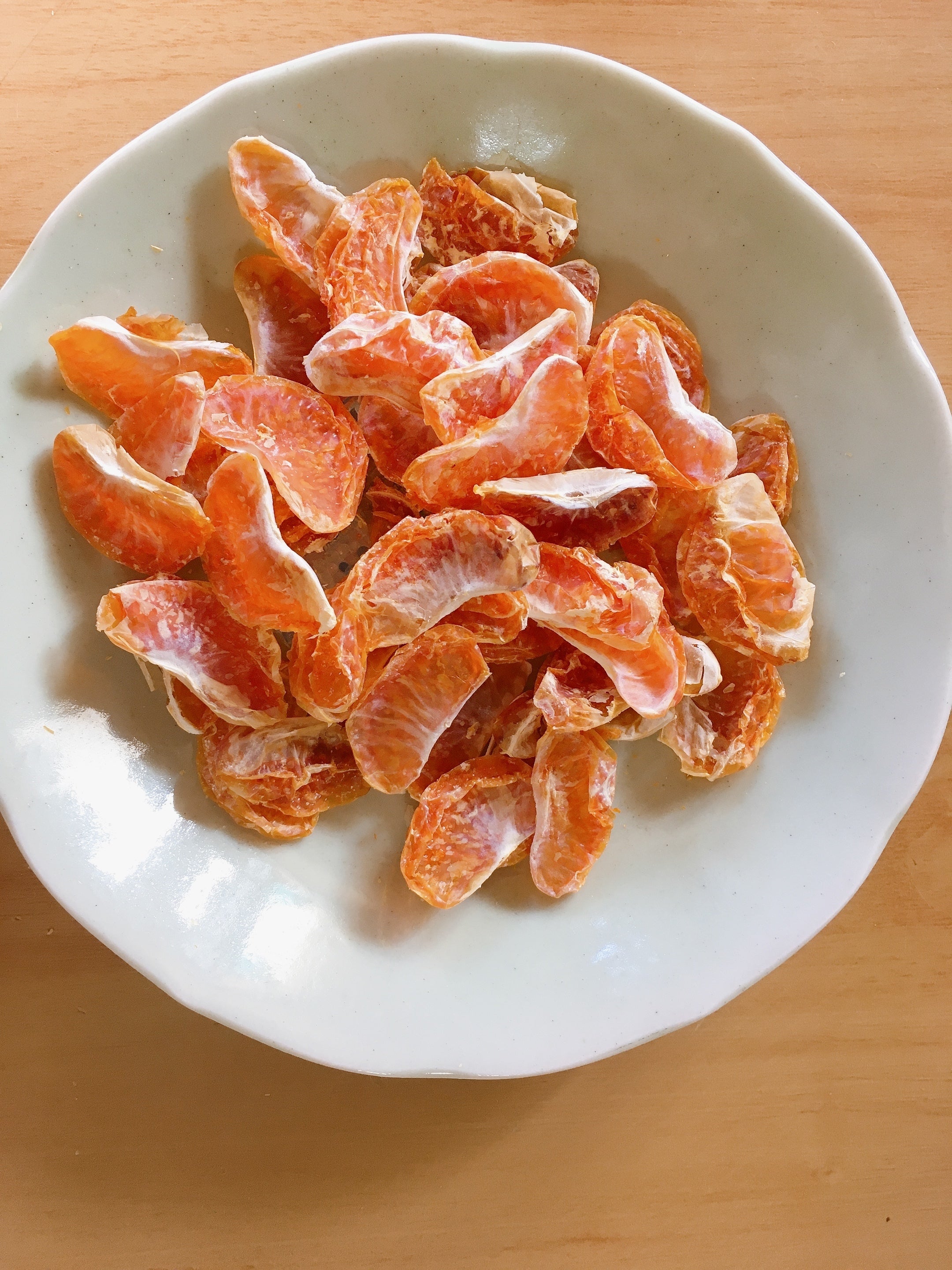 熊本産のみかんを使用してできたドライみかん。みかんを一房ずつ並べてじっくり乾かしました。こちらも皮に傷がついてしまったなどの訳ありのみかんを使用しています。