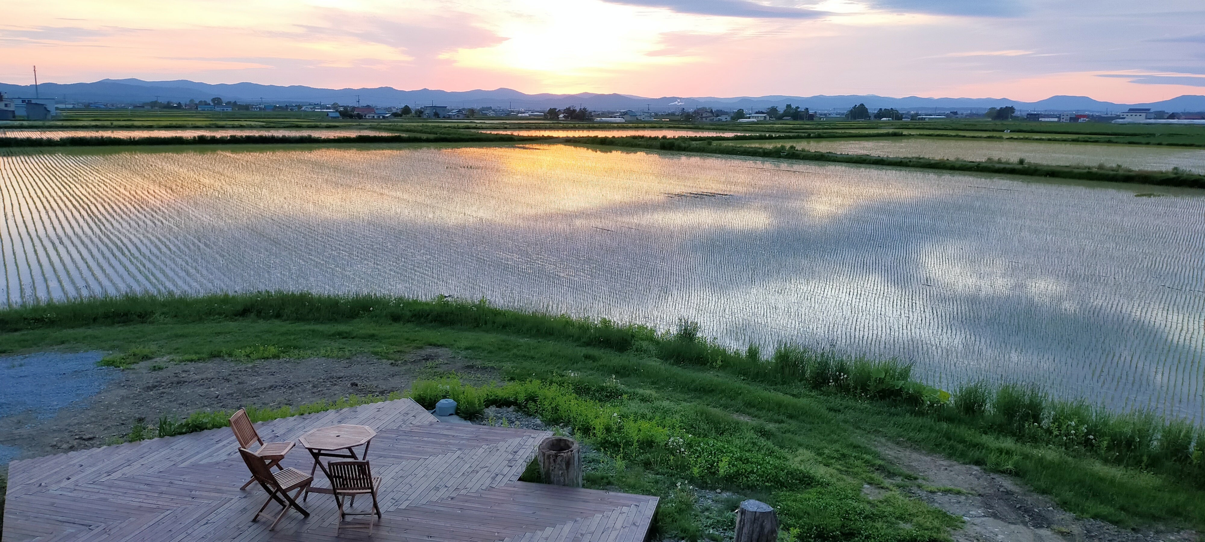 GW頃、田んぼに水が入ると湖畔のテラスになります。