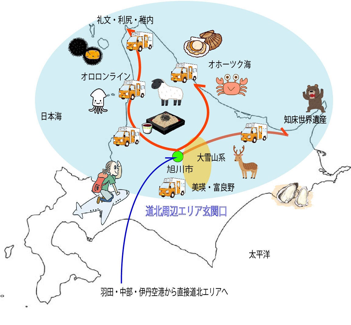 ここから道北エリアはもちろんのこと、富良野・美瑛、層雲峡・大雪山系、日本海側やオホーツク海側へもアクセスできます。