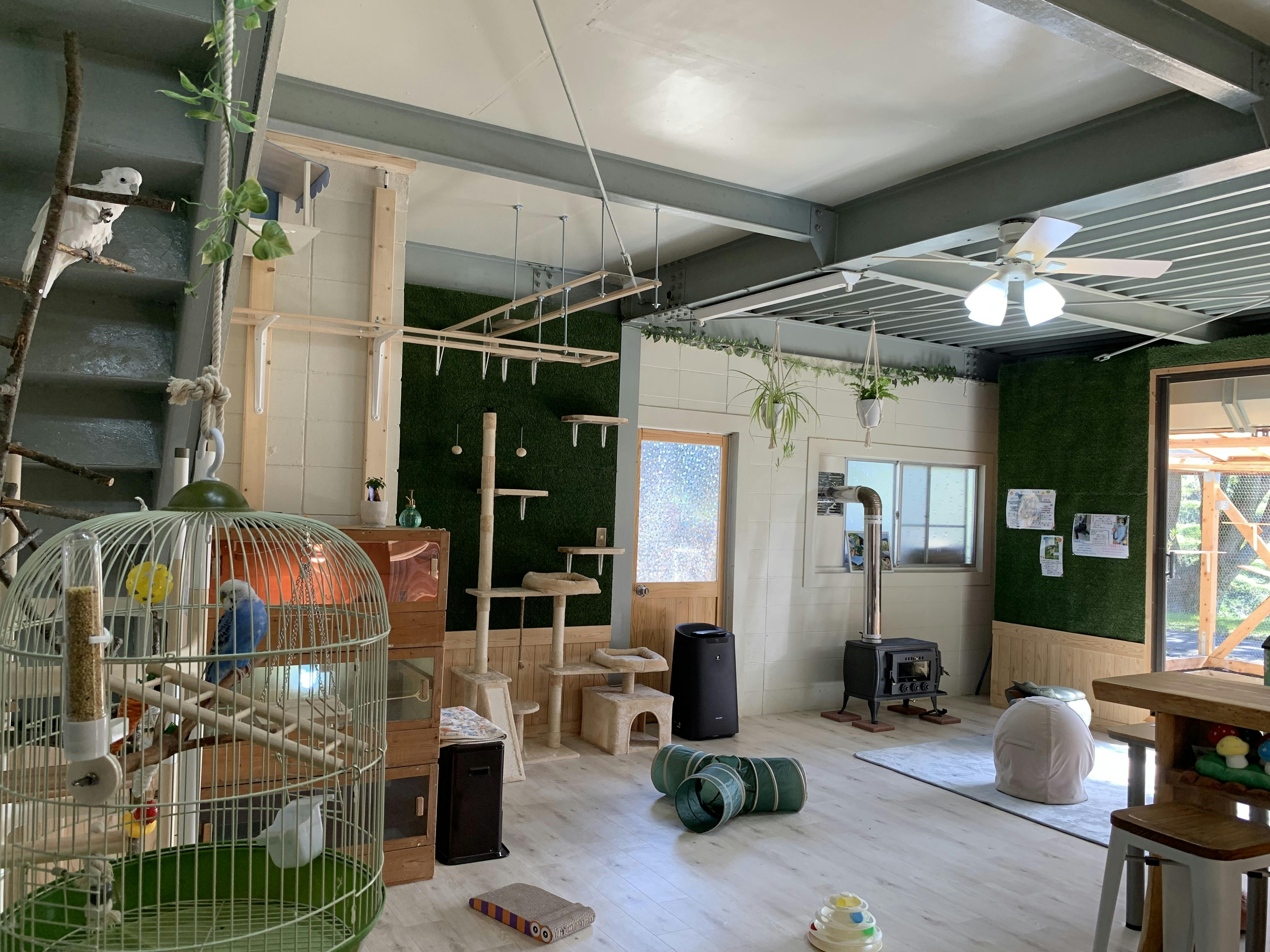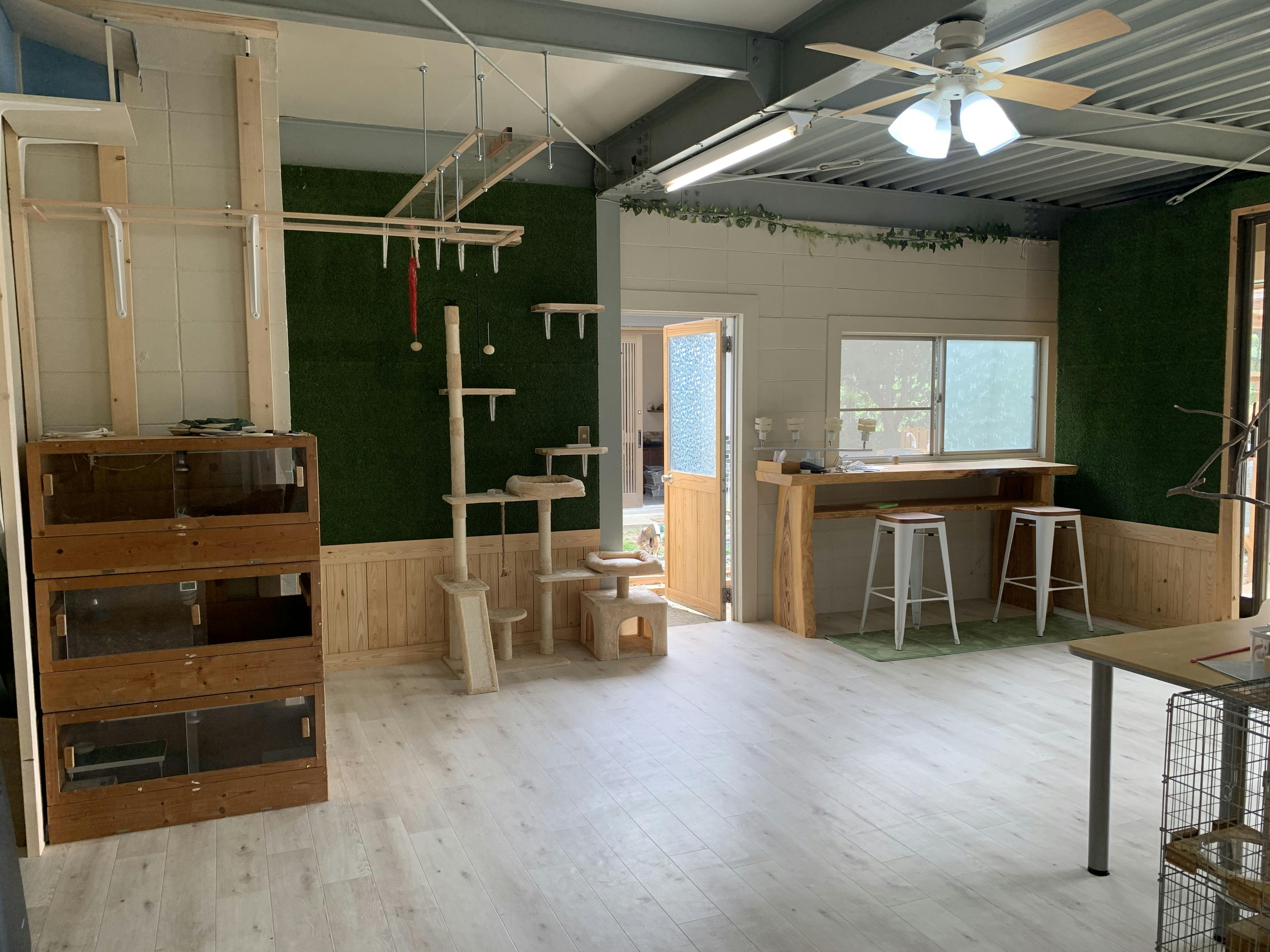 店内にはハンモックチェアや、上記にもある靴を脱いで座れる簡易個室を設置し、できる限り寛ぎながら動物とふれあえる空間作りを目指しています。また、動物たちも心地よく過ごせるように、寒い日でも日光浴ができる大きな窓の設置、屋外放飼場には砂浴びができる砂場を作り、室内にはキャットタワーなどを設置し、動物が遊べるような空間にしたいと思っています。