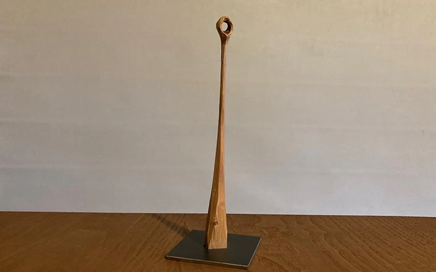 木の種類は檜。鉄の土台に支えられた高さ20cmの作品です。(自然の風合いを生かしているため、節の大きさは5cm程異なる場合があります。)