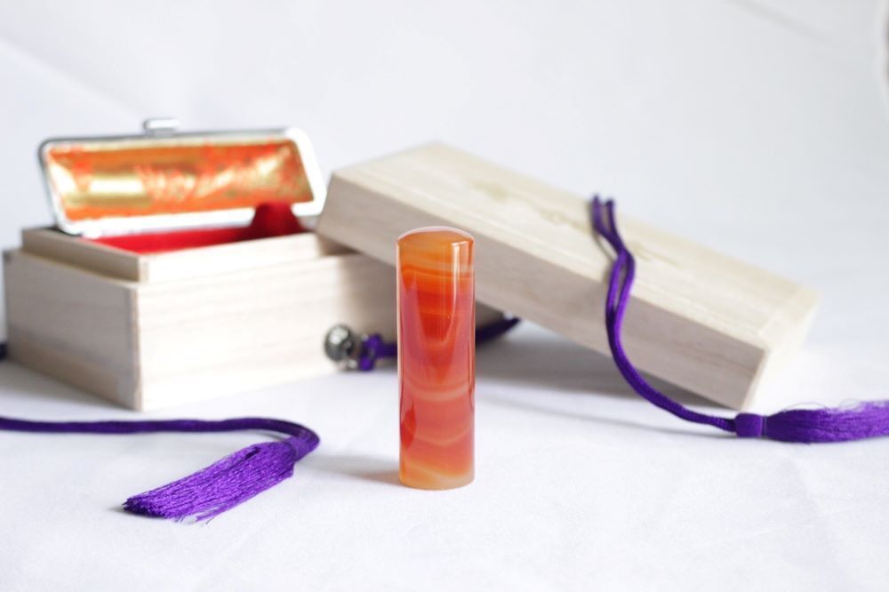 宝石言葉が成功、健康、長寿、富である赤瑪瑙(赤メノウ)はパワーストーンとしても人気のある石。集中力や持続力、忍耐力をもらたし、情熱と行動力を呼び覚ましてくれると言われています。人生の新たな門出を迎える方に最適な印鑑です。