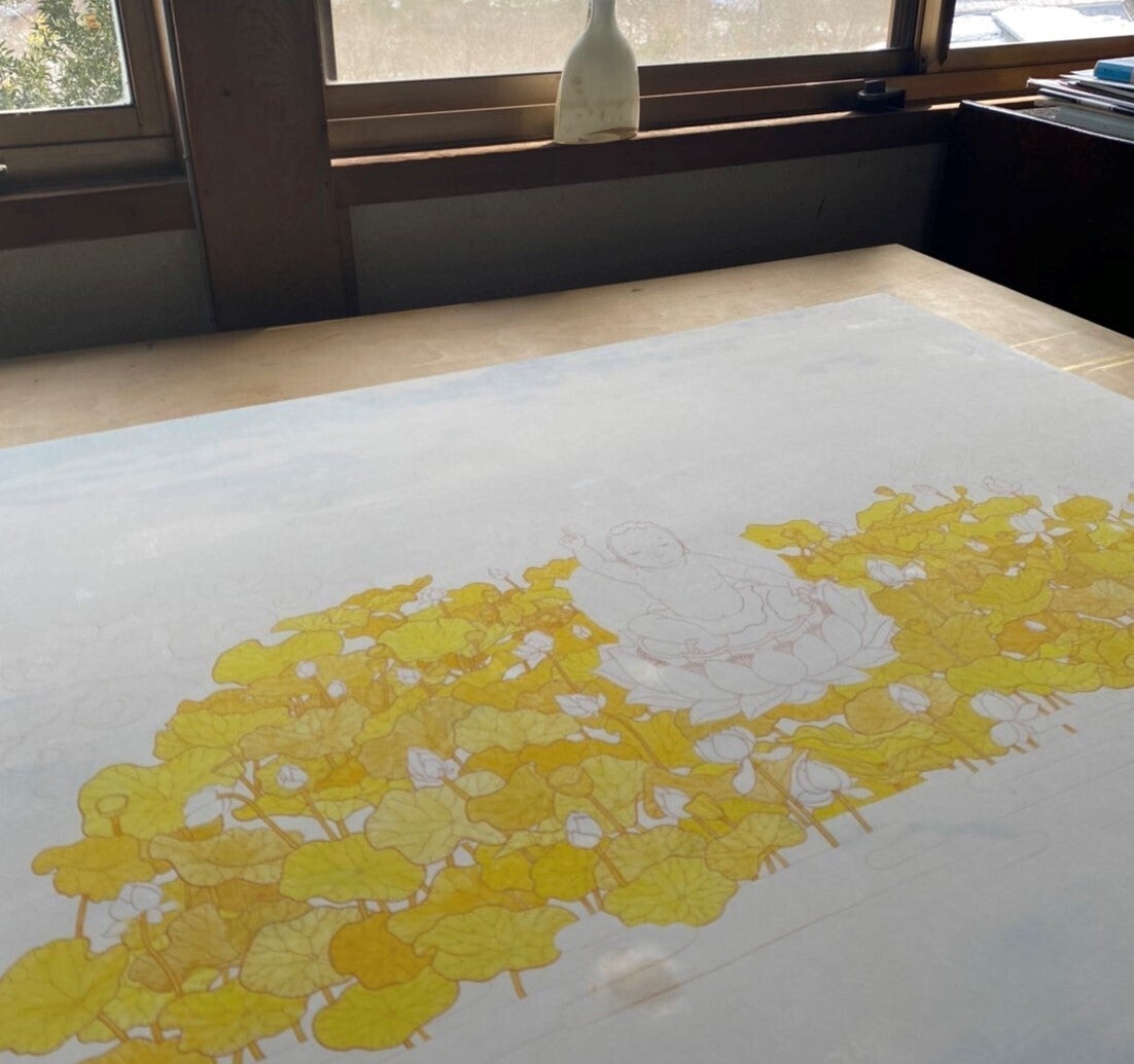 トレースから何度も線描を繰り返しながら、やっと下塗りまで漕ぎ着けました。