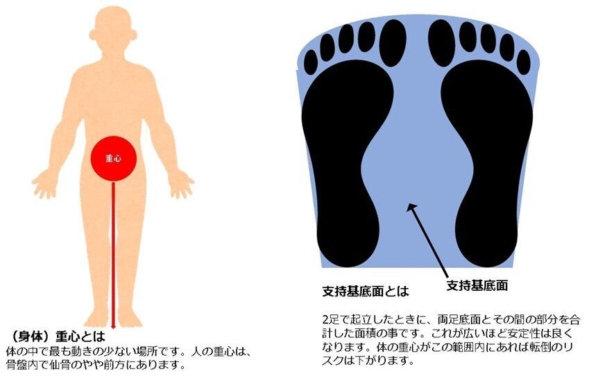下の図を見てください、通常、人体の重心は支持基底面(両足底面とその間の部分を合計した面積)の範囲内にあるので、バランスが保たれており転倒することはありません。