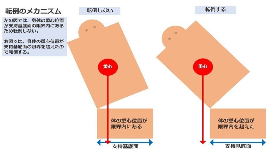 体の重心位置が支持基底面から逸脱する点を安定性の限界と呼び、その限界を超えた場合に不安定となり転倒するリスクが一気に高まります。