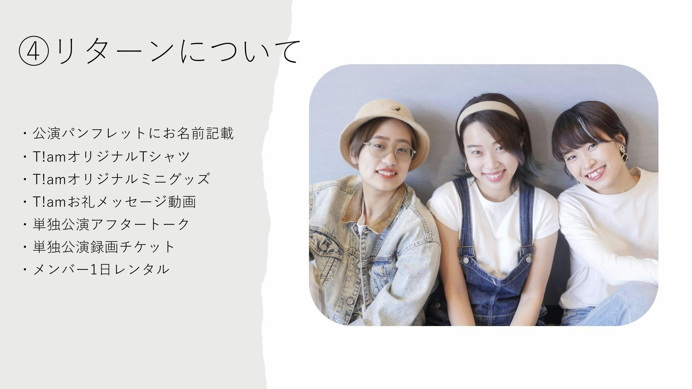 ・稽古場ご招待!(未完成の作品を一足先に見られます。もしかしたらT!amと一緒に踊れるかも?!) ※2022年8月ごろに東京某所もしくは静岡某所で行われる稽古にご招待予定です。お好きな方をお選び頂けます。なお、交通費等の費用はリターンには含まれませんのでご了承ください。