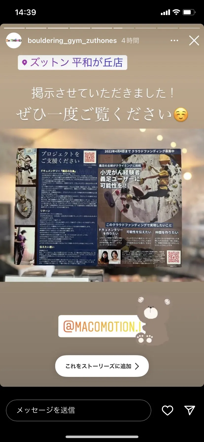パラクライミング日本選手権大会でご一緒したナビゲーター・小島理瑚さんにご縁を繋いでいただいて、チラシを掲示していただきました。